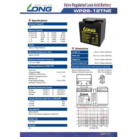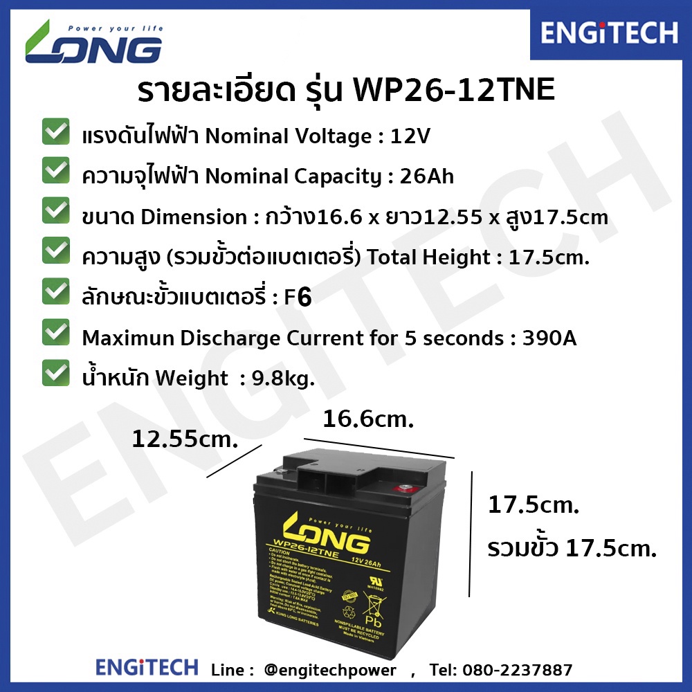 LONG แบตเตอรี่ แห้ง WP26-12TNE ( 12V 26AH ) สำรองไฟ ฉุกเฉิน รถไฟฟ้า ระบบ อิเล็กทรอนิกส์ UPS