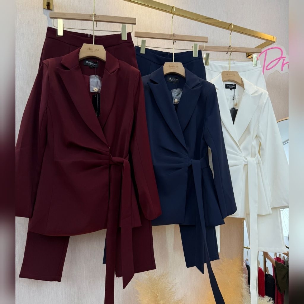 Charissa แท้💯ตรงปก✨พร้อมส่งทั้งร้านใน24ชม.💐เซทเสื้อ+กางเกงสไตล์สูทผู้หญิง ผ้าเงา ชุดออกงานสี ขาว แดง น้ำเงิน ดำ