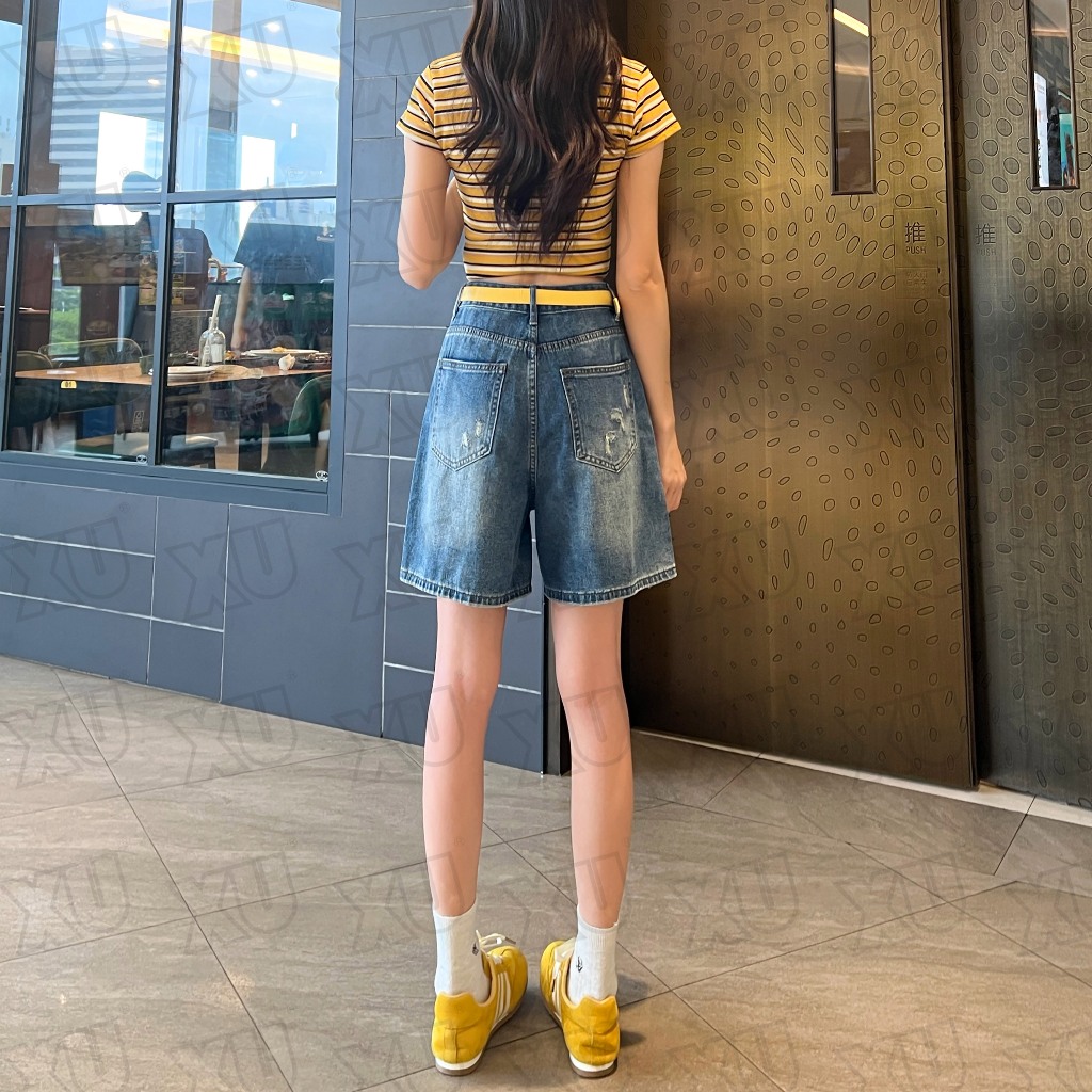 Beautified กางเกงยีนส์ขาดขาสั้นหลวม กางเกงขนาดพลัสสีฟ้าล้างน้ำ#V127