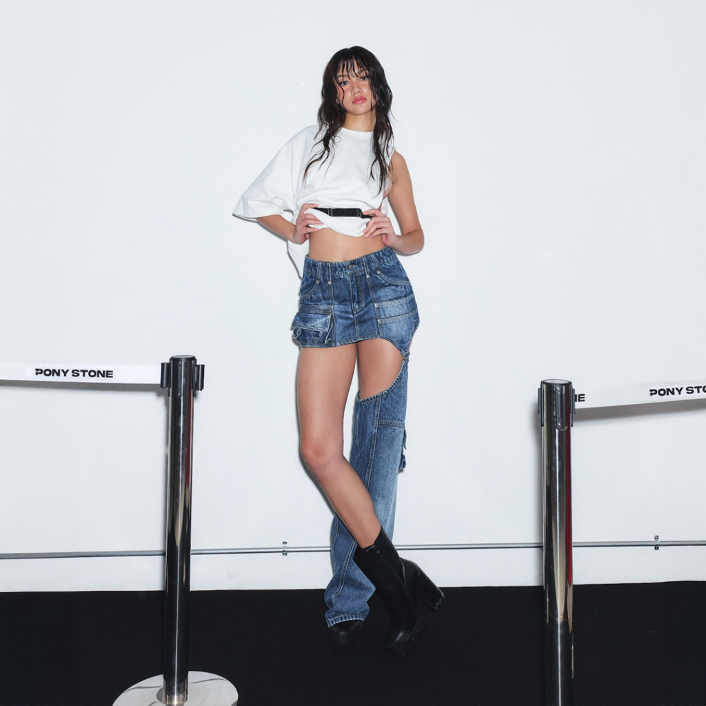 PONY STONE CHAOS Cargo denim skirt with a detachable leg sleeve