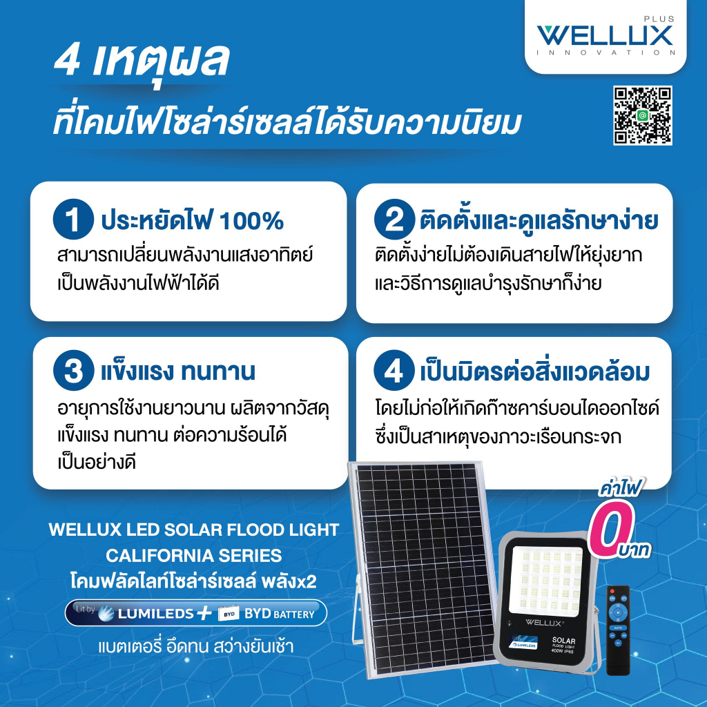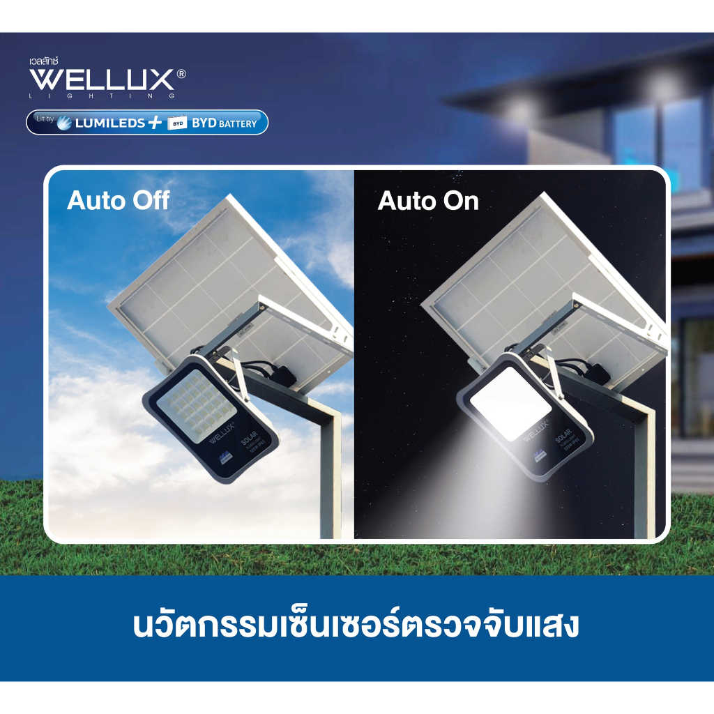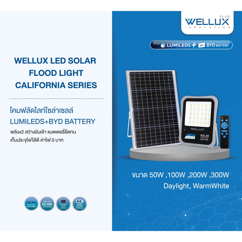 WELLUX โคมไฟฟลัดไลท์พลังงานแสงอาทิตย์ 50W 100W 200W 300W 400W 500W แสงขาว แสงวอร์ม LED Solar Floodlight