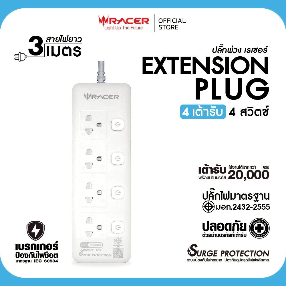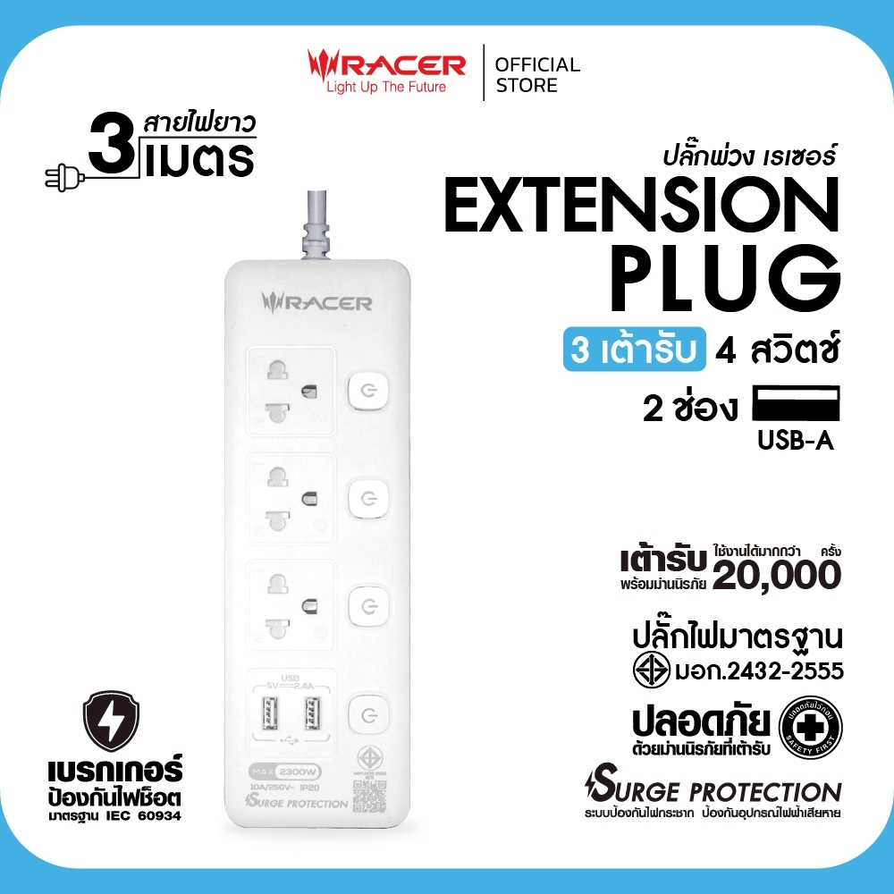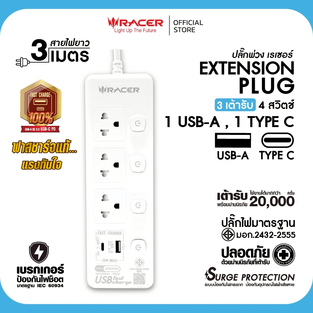 Racer ปลั๊กไฟ ปลั๊กพ่วง สายไฟทองแดงแท้ วัสดุไม่ลามไฟ ฟาสชาร์จแท้ 100% มาตราฐาน มอก.