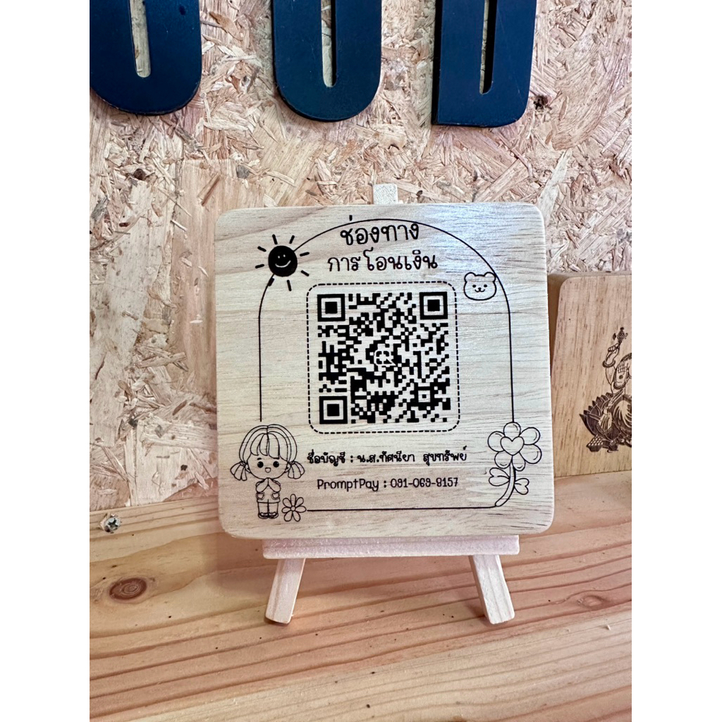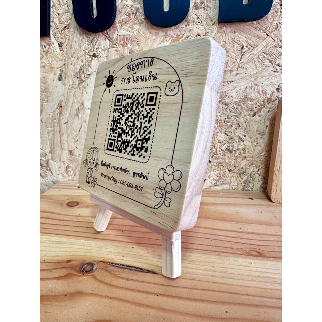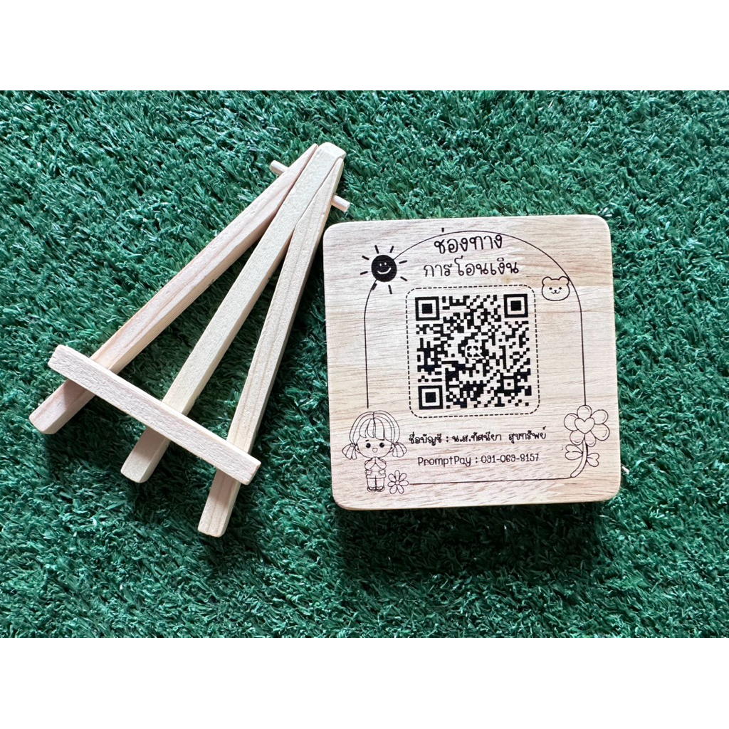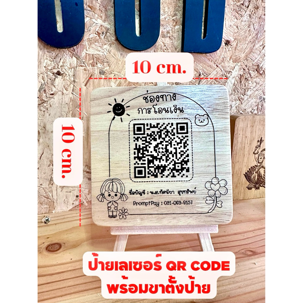 ป้ายรับเงิน ป้ายเลเซอร์ QR CODE ขนาด 10x10cm.พร้อมขาตั้งป้าย มีให้เลือก 6 แบบ