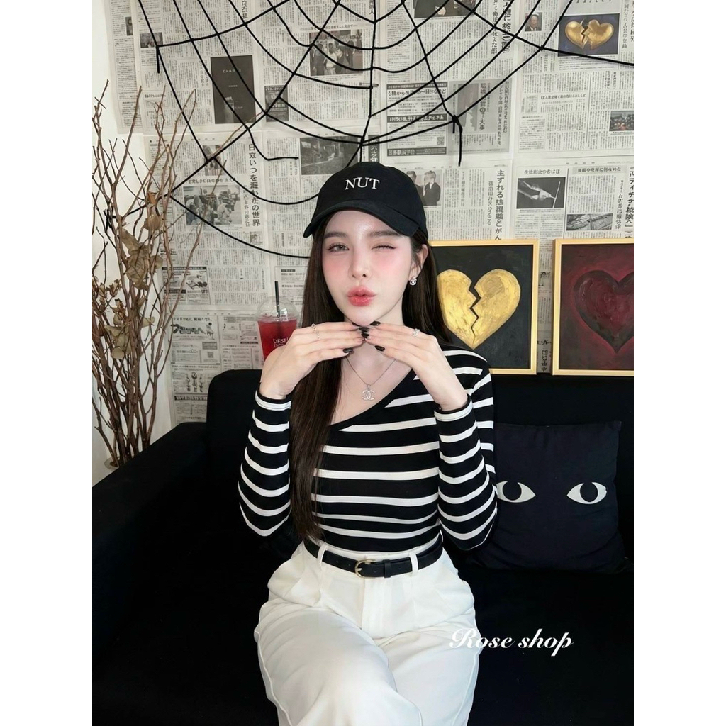 #Roseshop setเสื้อปาดไหล่ ลายริ้ว + กางเกงขายาวแถมเข็มขัด ลุคนี้สวยไฮโซสุด สาวติดแกรม