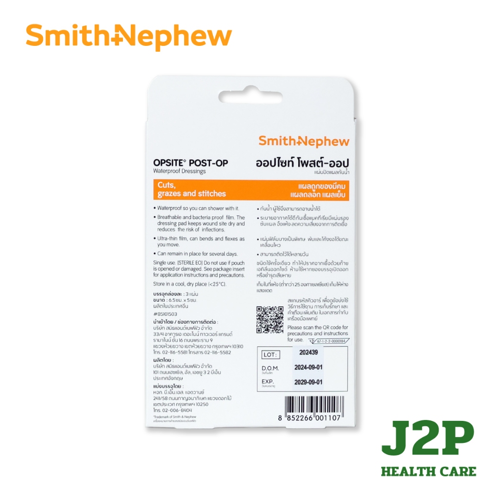 Smite & Nephew Opsite POST - OP แผ่นปิดแผลกันน้ำ พร้อมแผ่นรองซับ ฟิล์มใสปิดแผล ติดอาบน้ำได้ ระบายอากาศดี ขนาด 6.5x5 cm.