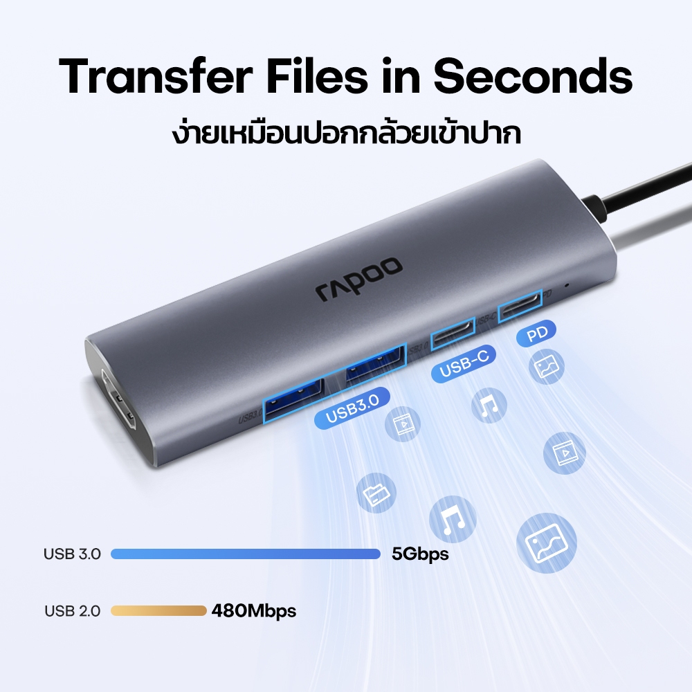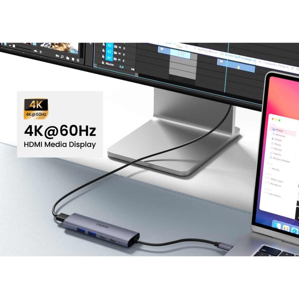 Rapoo XD51 USB-C Hub 5-in-1 รองรับ 4Kx60Hz + PD100W (อินพุต) ฮับ Type-C 5-in-1 USB3.0 x2 / USB-C x1 อะแดปเตอร์ฮับ