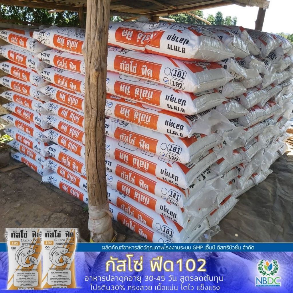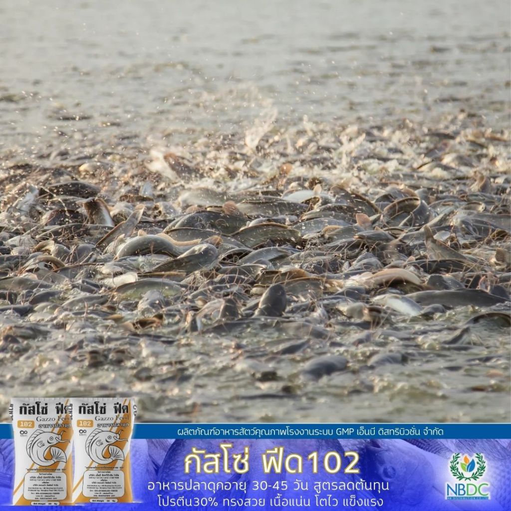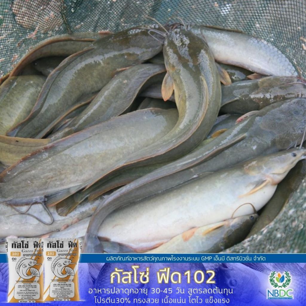 กัสโซ่ฟีด 102 อาหารปลาดุก โปรตีน30% เม็ดกลาง สำหรับอายุ 45–90 วัน สูตรลดต้นทุน สูตรมาตรฐานจาก NBDC