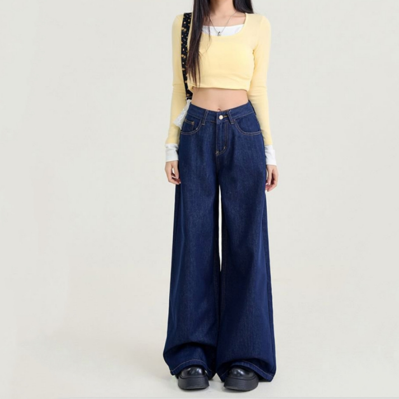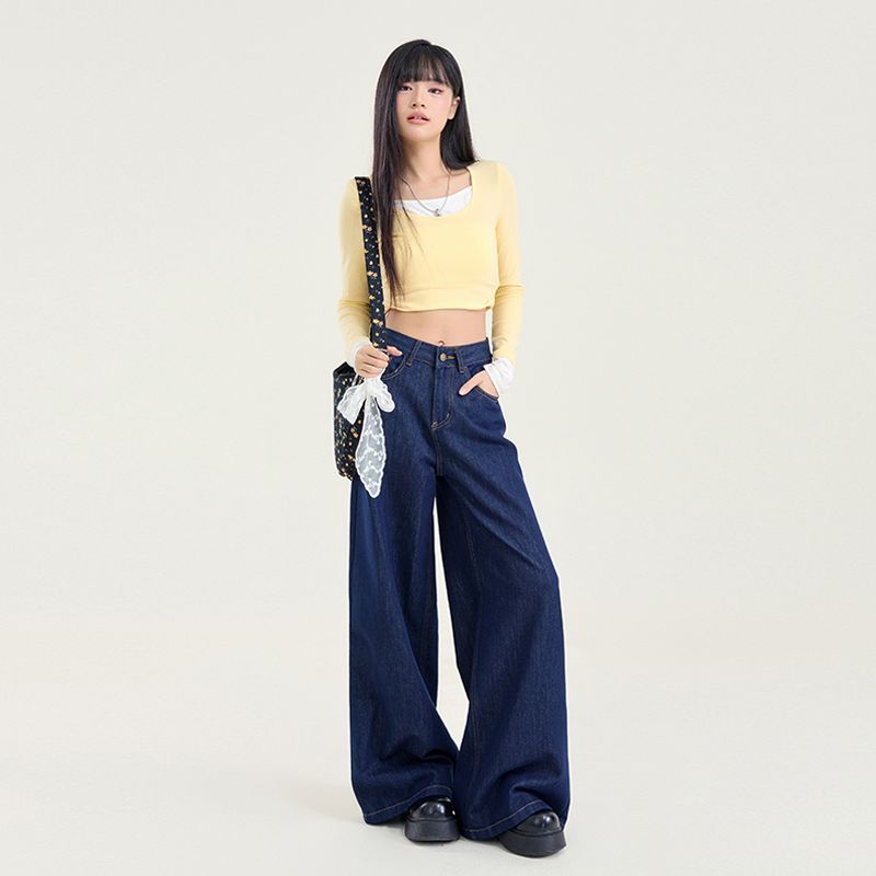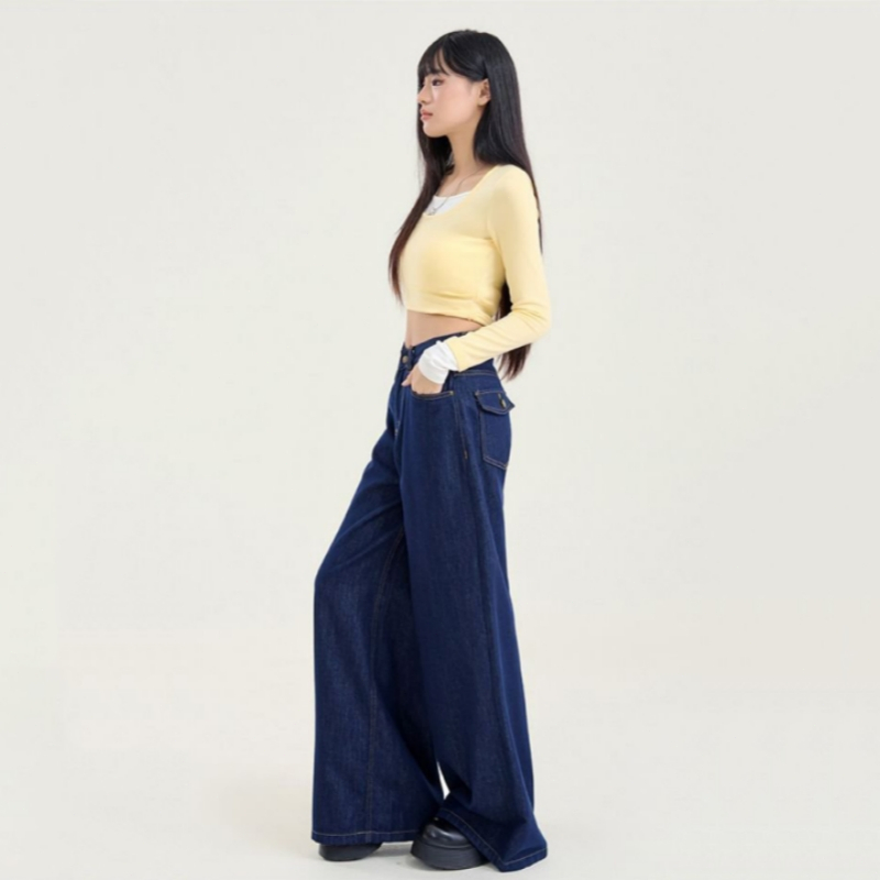 Bived S-7XL กางเกงยีนส์ผู้หญิง สีน้ำเงินเข้ม กางเกงยีนส์ขายาว เอวสูง ทรงตรง ทรงหลวม ขากว้าง กางเกง