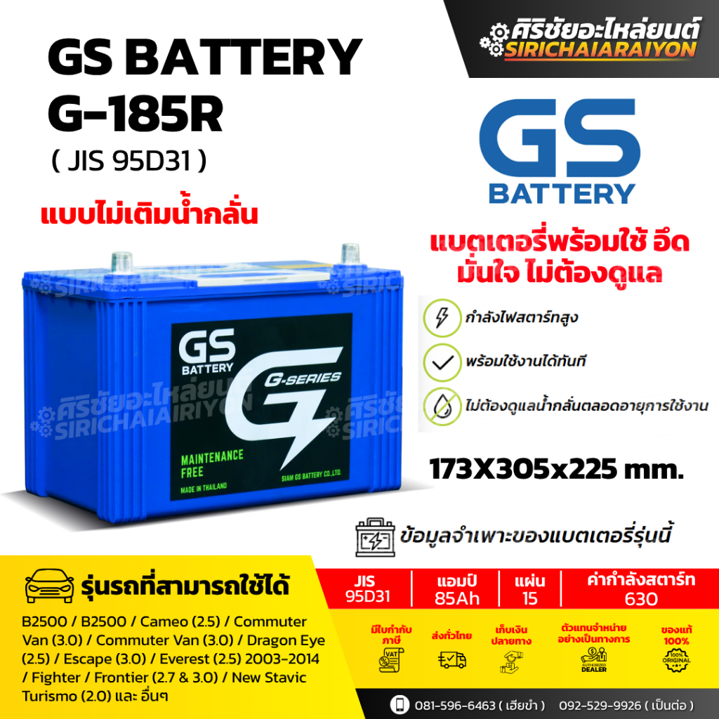 แบตเตอรี่รถยนต์ GS Battery G-185L และ G-185R (แบบไม่เติมน้ำกลั่น) รับประกันของแท้100%
