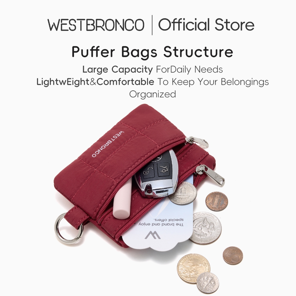 WESTBRONCO รุ่นชิฟฟ่อน (Chiffon) – กระเป๋า Card Holder เป็นกระเป๋าสตางค์แบบคล้องมือสำหรับผู้หญิง ผลิตจากไนลอนลายควิลท์ และมีระบบป้องกันการสแกนRFID ที่มาพร้อมช่องซิป 2 ช่อง มีสายคล้องคอ และช่องใส่บัตร