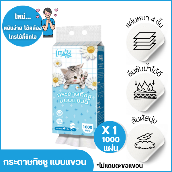 ทิชชู่แบบแขวน 1 ชิ้น Lucky Care 1000 แผ่น แผ่นหนา 4 ชั้น 3 ซึมซับน้ำได้เยี่ยม สัมผัสนุ่ม