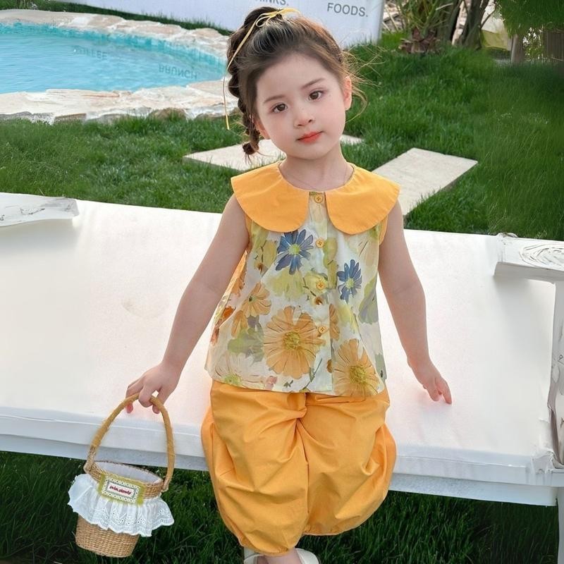 MooDeng Baby 2ชิ้น เสื้อ กางเกง คอตุ๊กตา แฟชั่นเด็ก ฤดูร้อน เสื้อกั๊ก เสื้อแขนกุด เด็กผู้หญิง