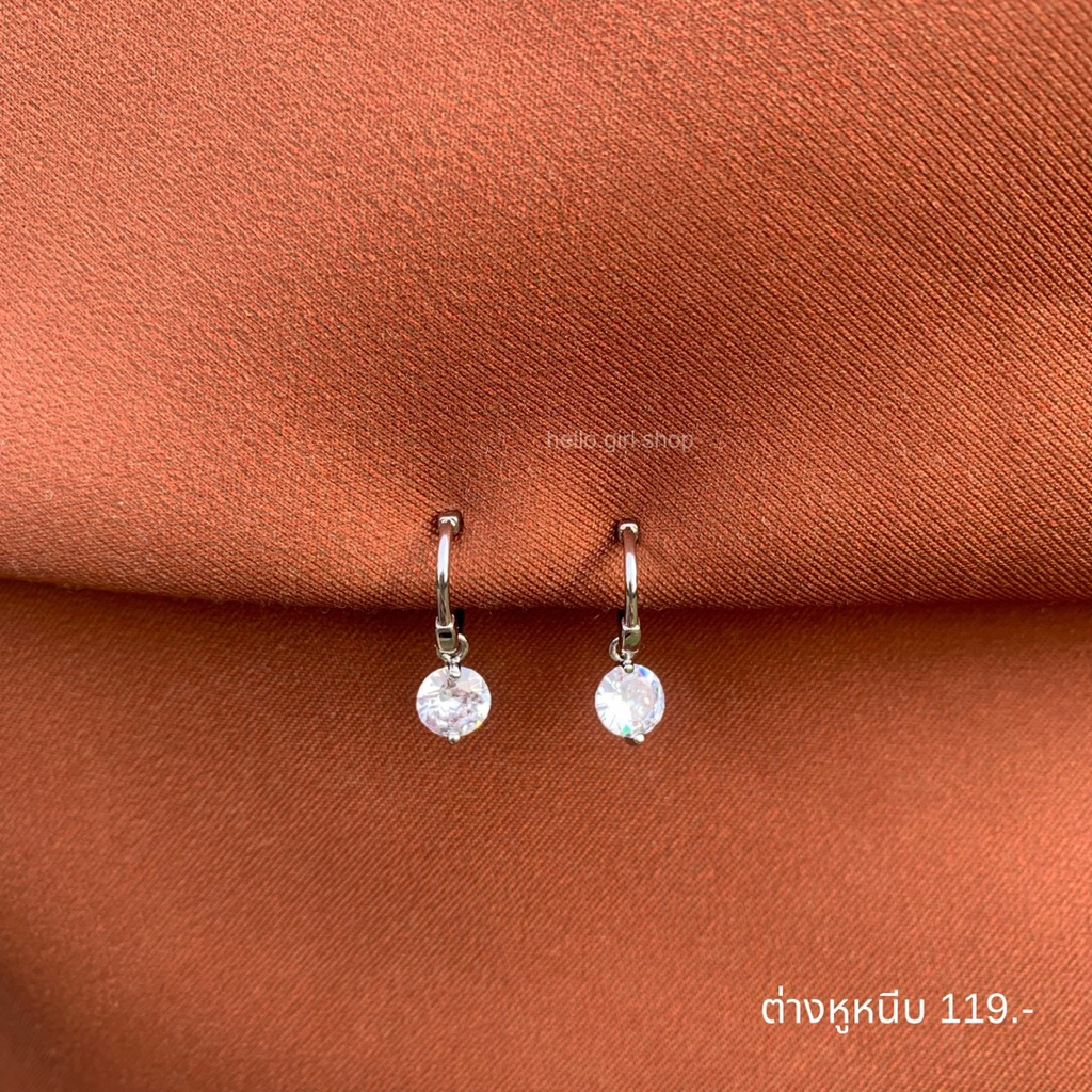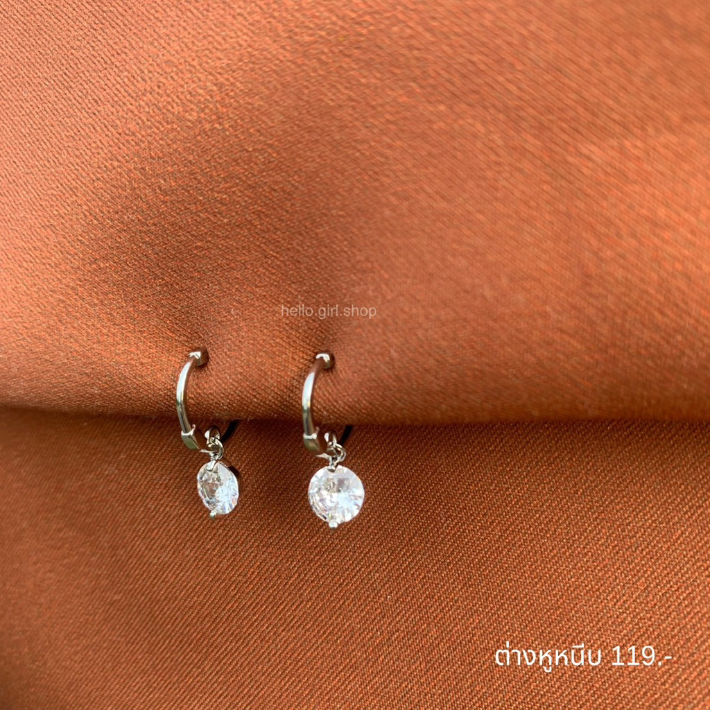 ( ต่างหูหนีบ ขดลวด ) ต่างหูห่วง ห้อยเพชรกลม สีเงิน