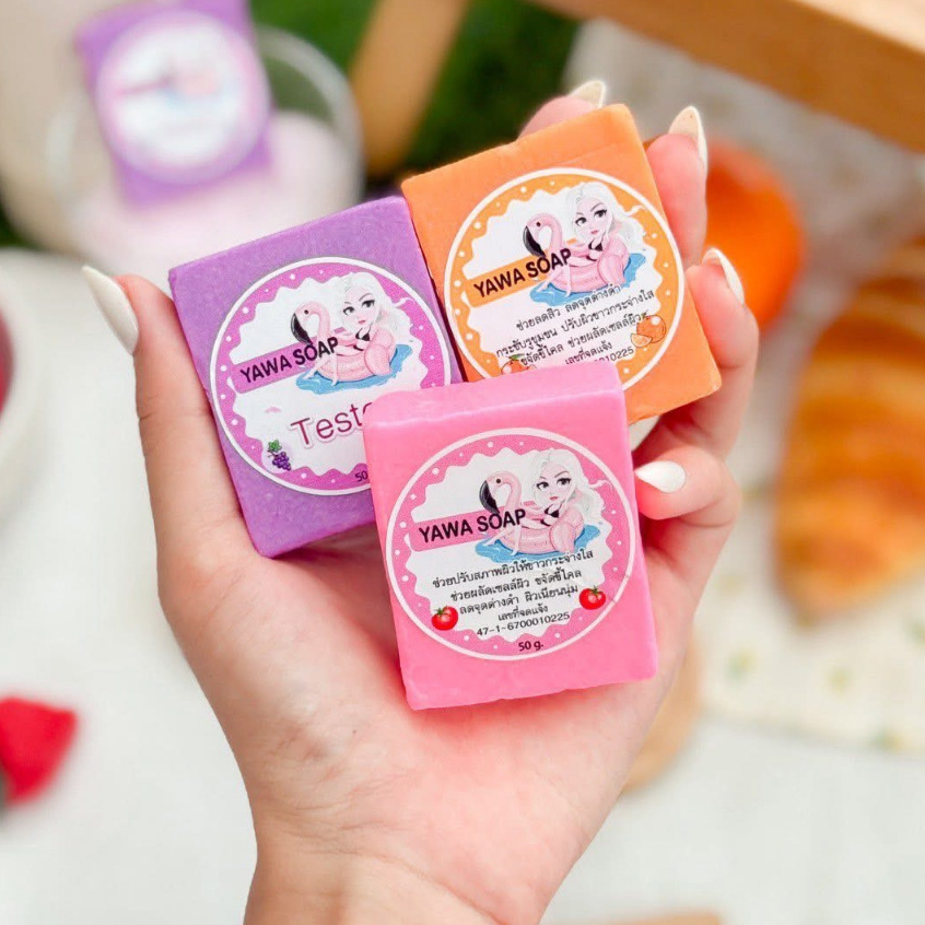 3 ก้อน ญาวา YAWA SOAP สบู่ญาวา สารสกัดจากมะเขือเทศ /ส้ม /องุ่น เพื่อผิวสวยใส ขนาด 50 กรัม