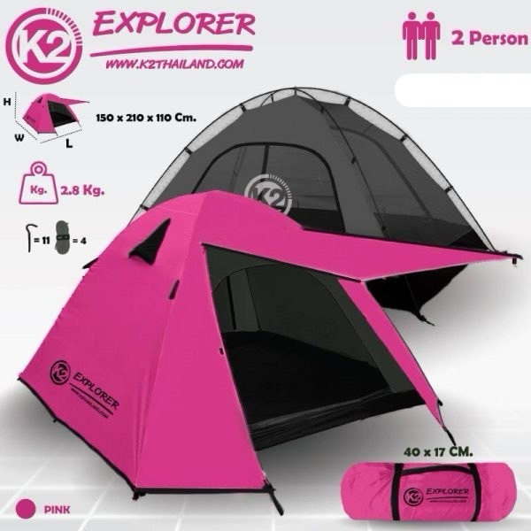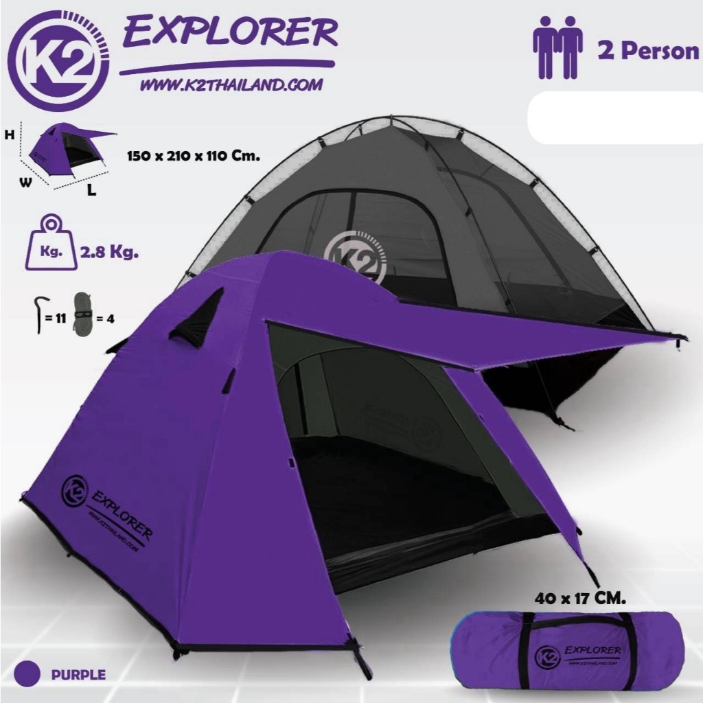 K2 รุ่น EXPLORER เต็นท์พักแรม 2 คนนอน กางง่าย เสาโครงไฟเบอร์ กันลม กันฝน 3000mm. มีประกัน