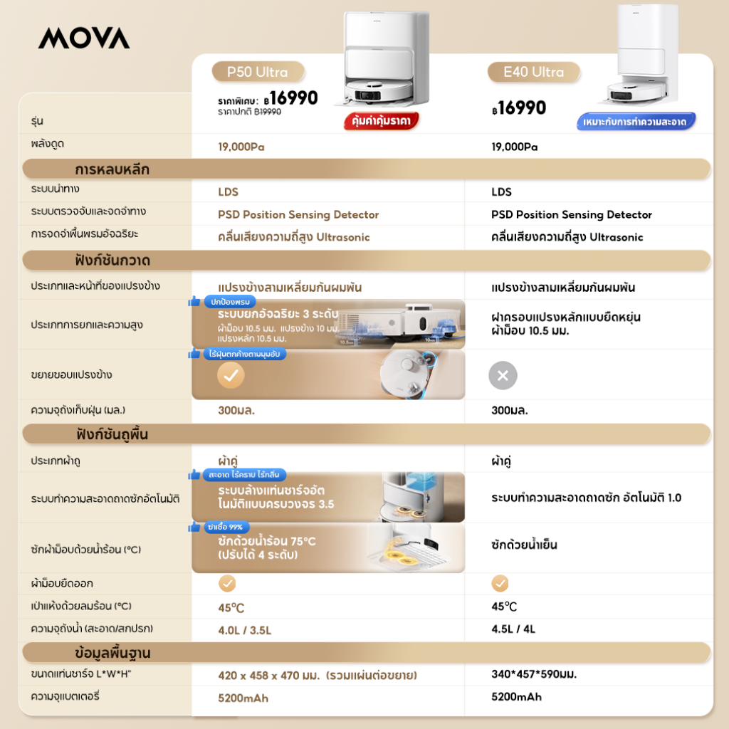【HOT SALE】MOVA E40/P50 Robot Vacuum Cleaner หุ่นยนต์ดูดฝุ่น ถูพื้น อัจฉริยะ แรงดูด19kPa 75วันไม่ต้องเทฝ่น ลมร้อนเป่าแห้ง