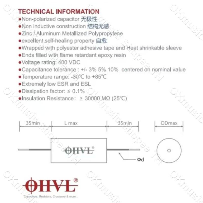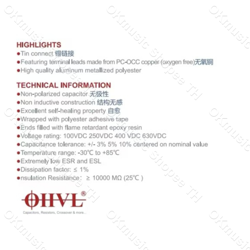 🎵 คาปาซิเตอร์เสียงแหลม OHVL ฟิล์มคุณภาพ 2.2uF และ 3.3uF ใช้ในระบบ Crossover ลำโพง HiFi 250V/400V เสียงแหลมใส
