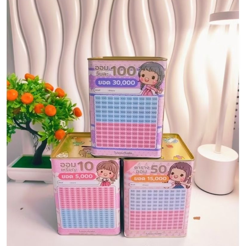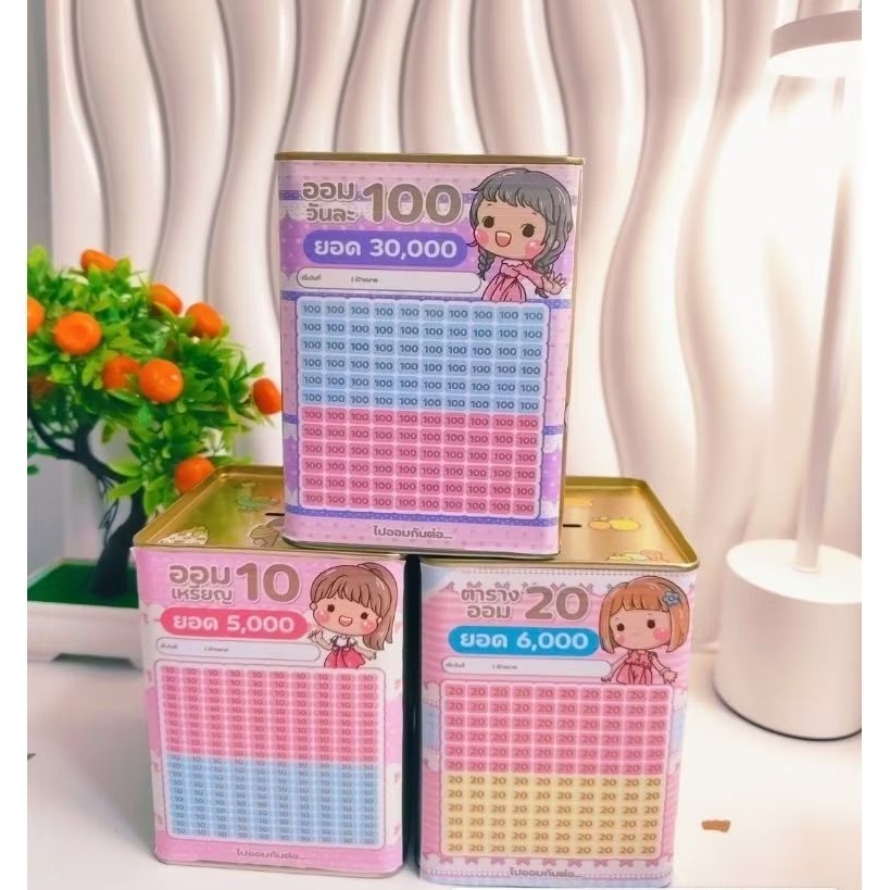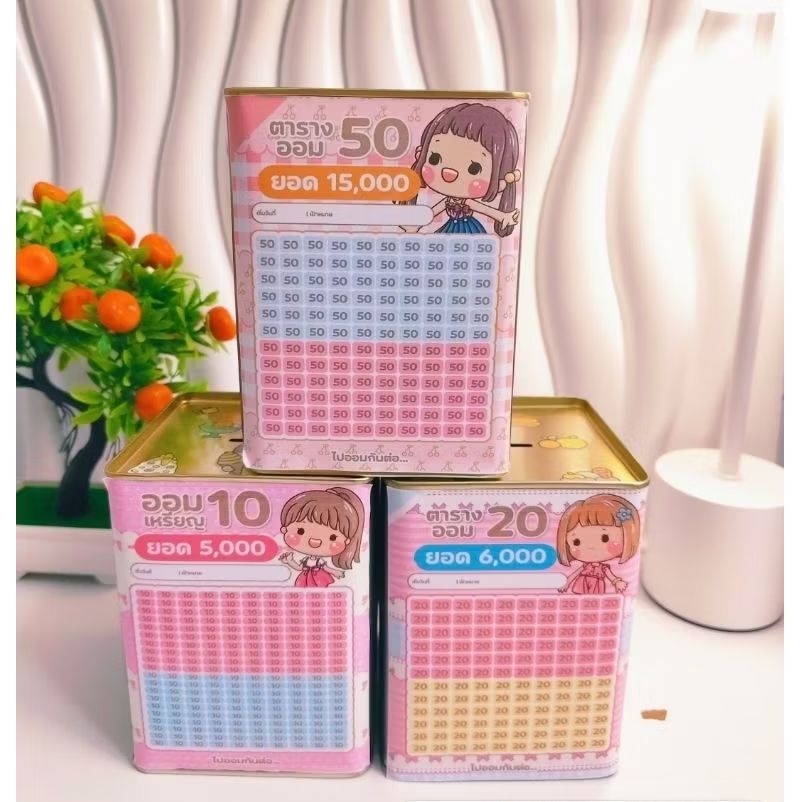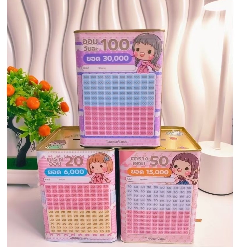 กระปุกออมสิน สูง14Cm ตร.2แผ่นพร้อมตารางสติ๊กเกอร์ กันชื้น ปากกา