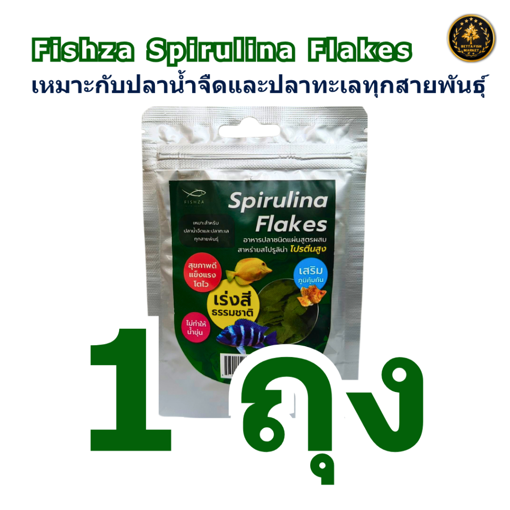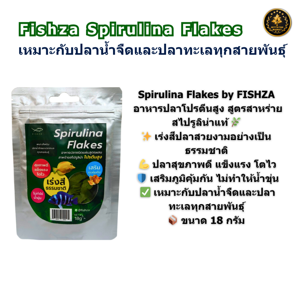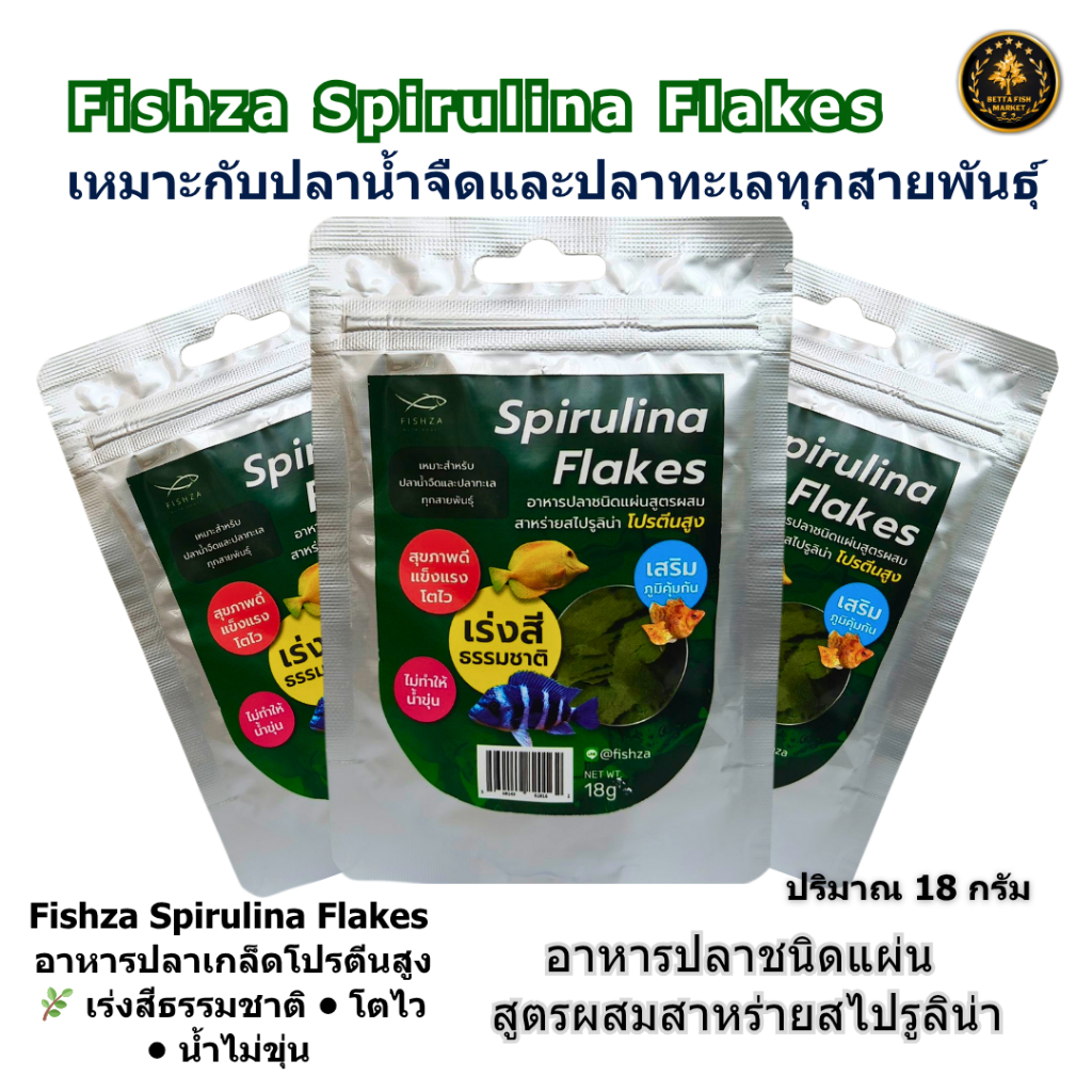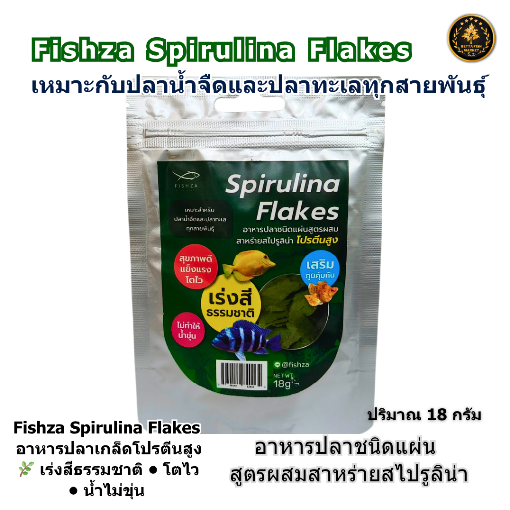 Fishza Spirulina Flakes อาหารปลาเกล็ดโปรตีนสูง สูตรสาหร่ายสไปรูลิน่า 18 กรัม สำหรับปลาสวยงามน้ำจืดและน้ำทะเล