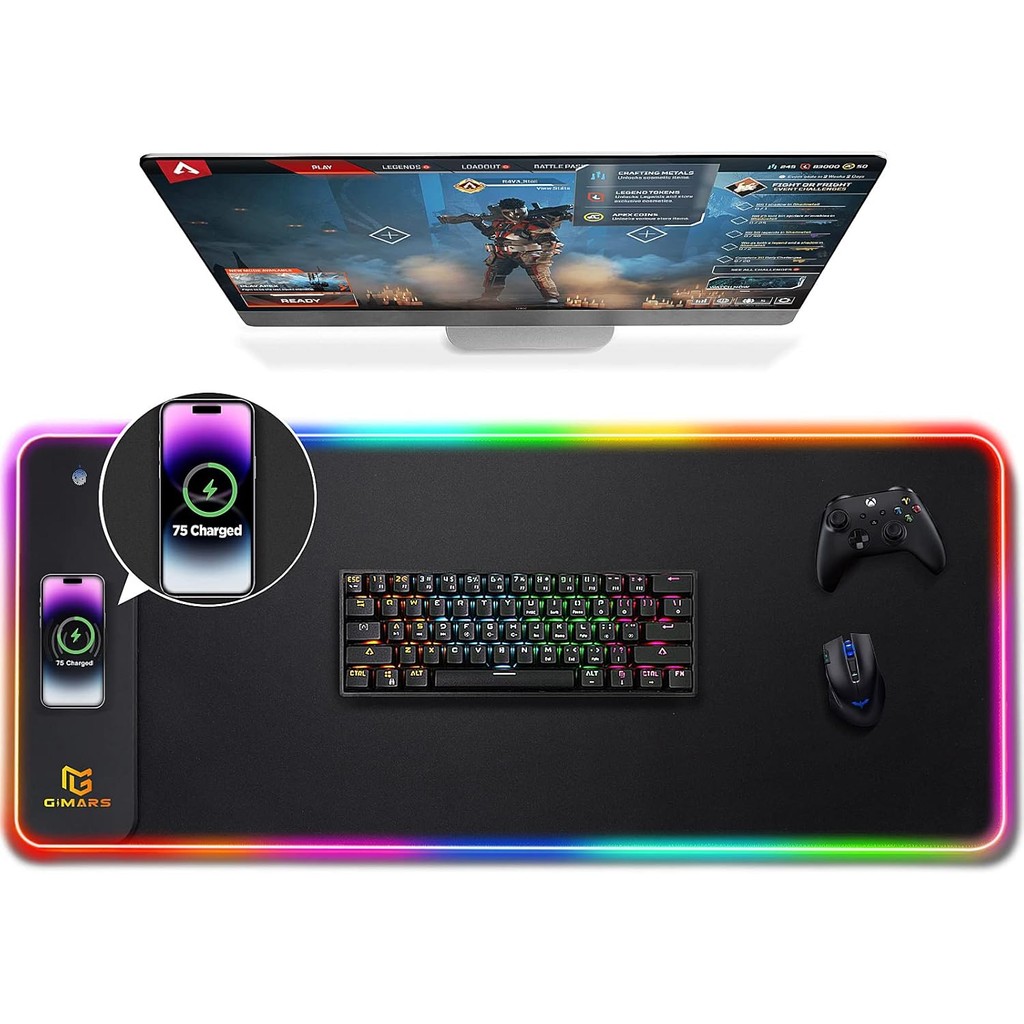 แผ่นรองเมาส์เกมมิ่ง RGB ชาร์จไร้สาย GIM 15W, กันน้ำและฐานยางกันลื่น, SAMIT แผ่นรองโต๊ะเกมมิ่งขยายสำหรับแล็ปท็อป/พีซี/สำนักงาน, ขนาด 30.7" X 11.8"