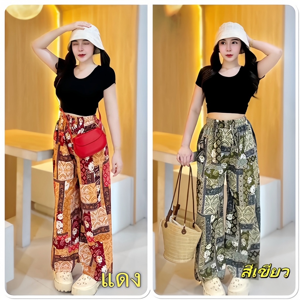โชคดีดอกไม้มงคล45รุ่นใหม่รวม_กางเกงกระบอกใหญ่ผ้าไหมอิตาลีสาวอวบใส่ได้ฟรีไซส์ เอวยืดมีเชือกรูดได้BOHO🌈BABAOTU🌈