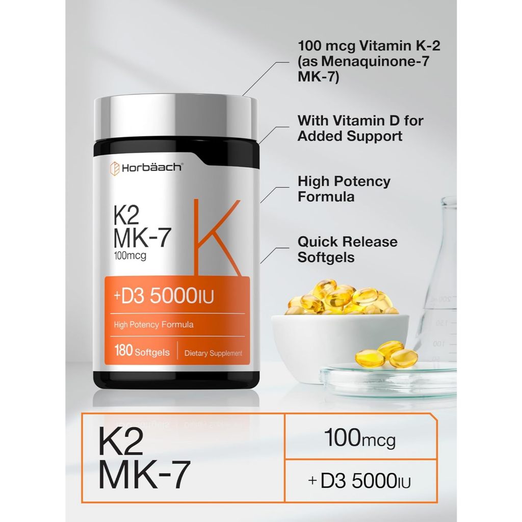 Horbaach Vitamin K2 with D3 | 180 Softgels | 800 mcg Complex with MK7 Plus MK4 | 5000 IU of D3 | Non-GMO (No.727)