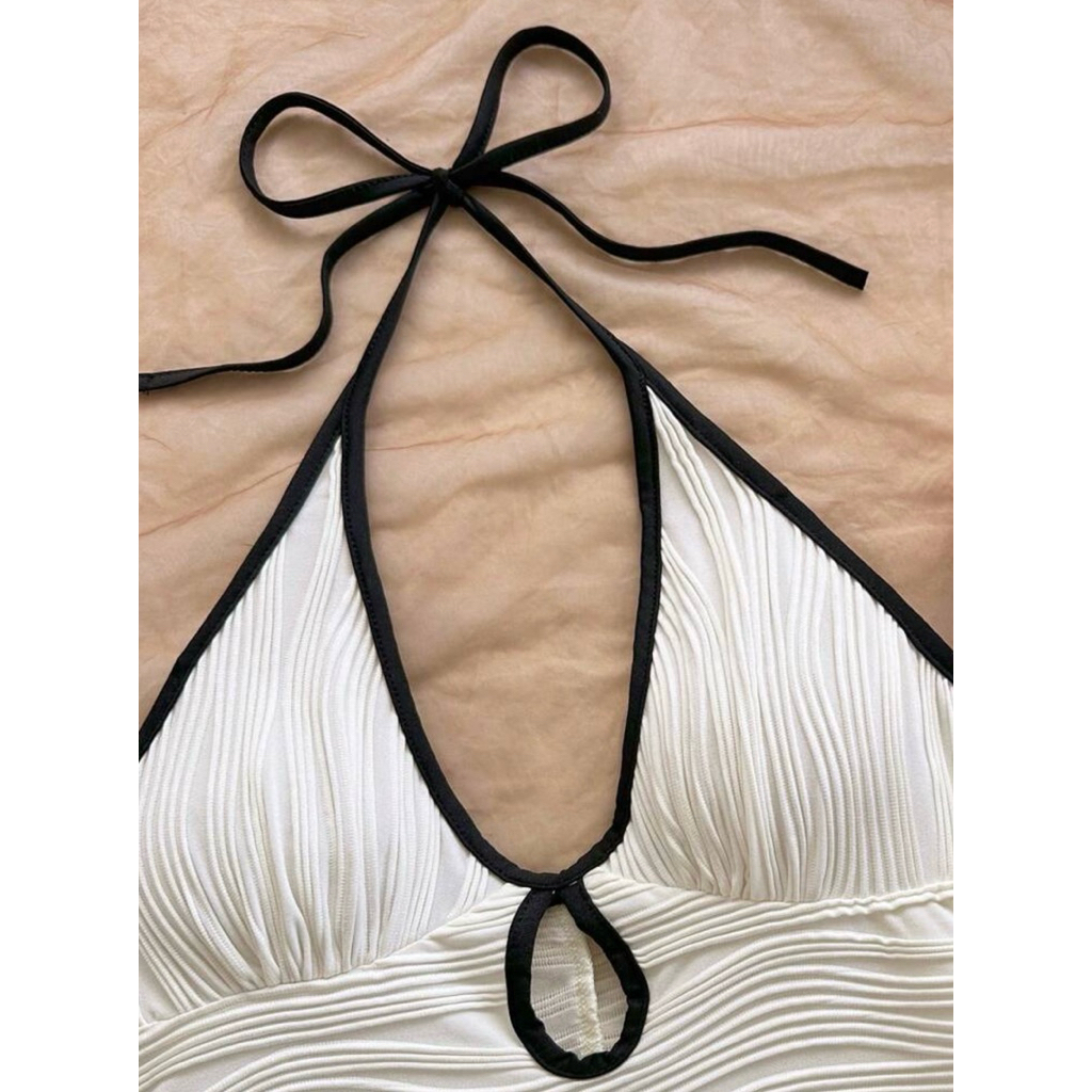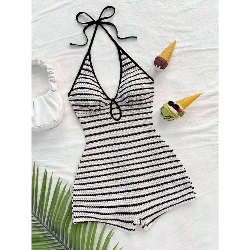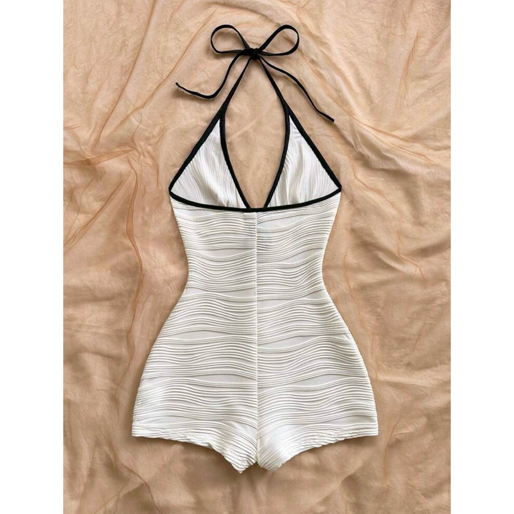 ชุดจั๊มกางเกงขาสั้น บอดี้สูท สายเดี่ยวคล้องคอ ขาสั้น มินิมอล แต่งขอบสี
