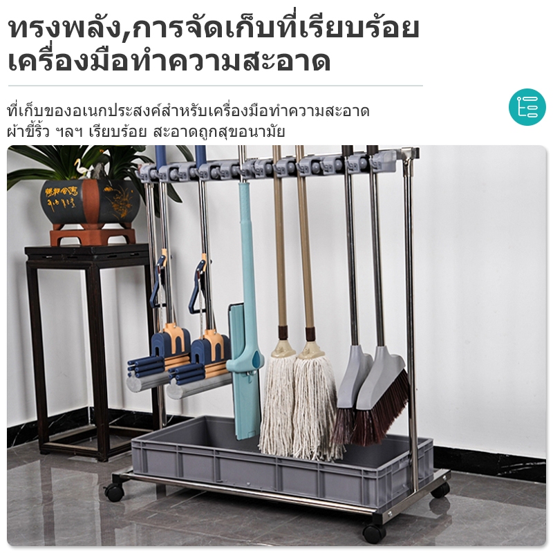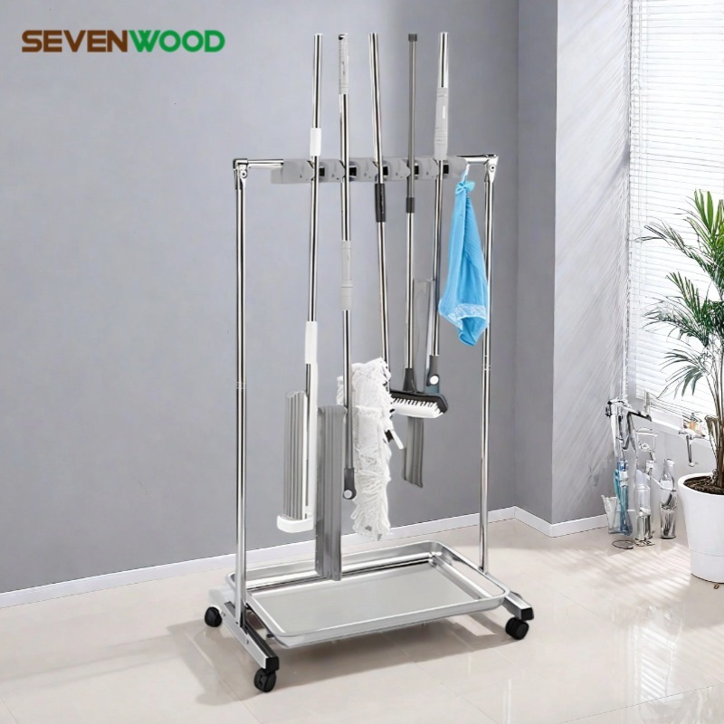 SEVENWOOD ชั้นวางไม้ถูพื้นสแตนเล ชั้นวางไม้ถูพื้นแบบเคลื่อนย้ายได้ ที่แขวนไม้กวาดชั้นเก็บของอุปกรณ์ทำความสะอาดจัดเก็บของ
