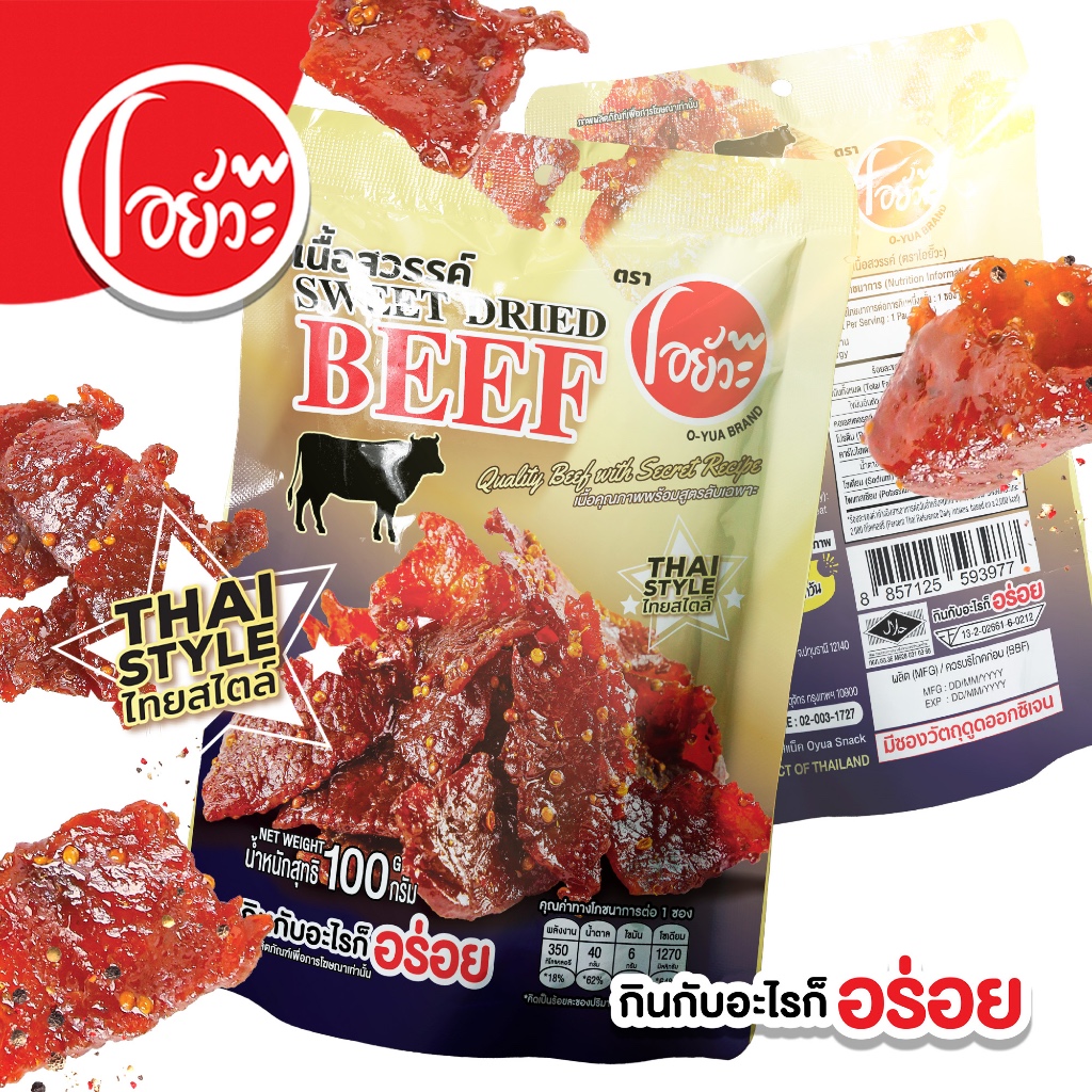 เนื้อสวรรค์ ตราโอยั๊วะ Sweet Dried Beef ขนาดบรรจุ 100 กรัม (จำหน่ายแบบยกลัง 24 ซอง) สินค้ามีฮาลาล