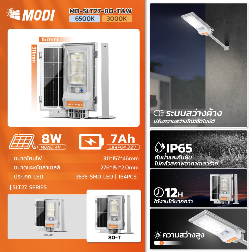 MODI ไฟโซล่าเซลล์ 80W 80Tแสงขาว แสงเหลือง solar light ระบบสว่างค้าง โซล่าเซลล์ เปิดปิดอัตโนมัติ IP65