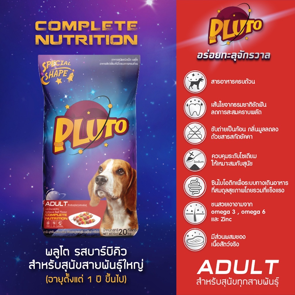Pluto รสเนื้อบาร์บีคิว ขนาด 20 kg. รสเนื้อบาร์บีคิว อาหารเม็ดสำหรับสุนัขพันธุ์ใหญ่ทุกสายพันธุ์