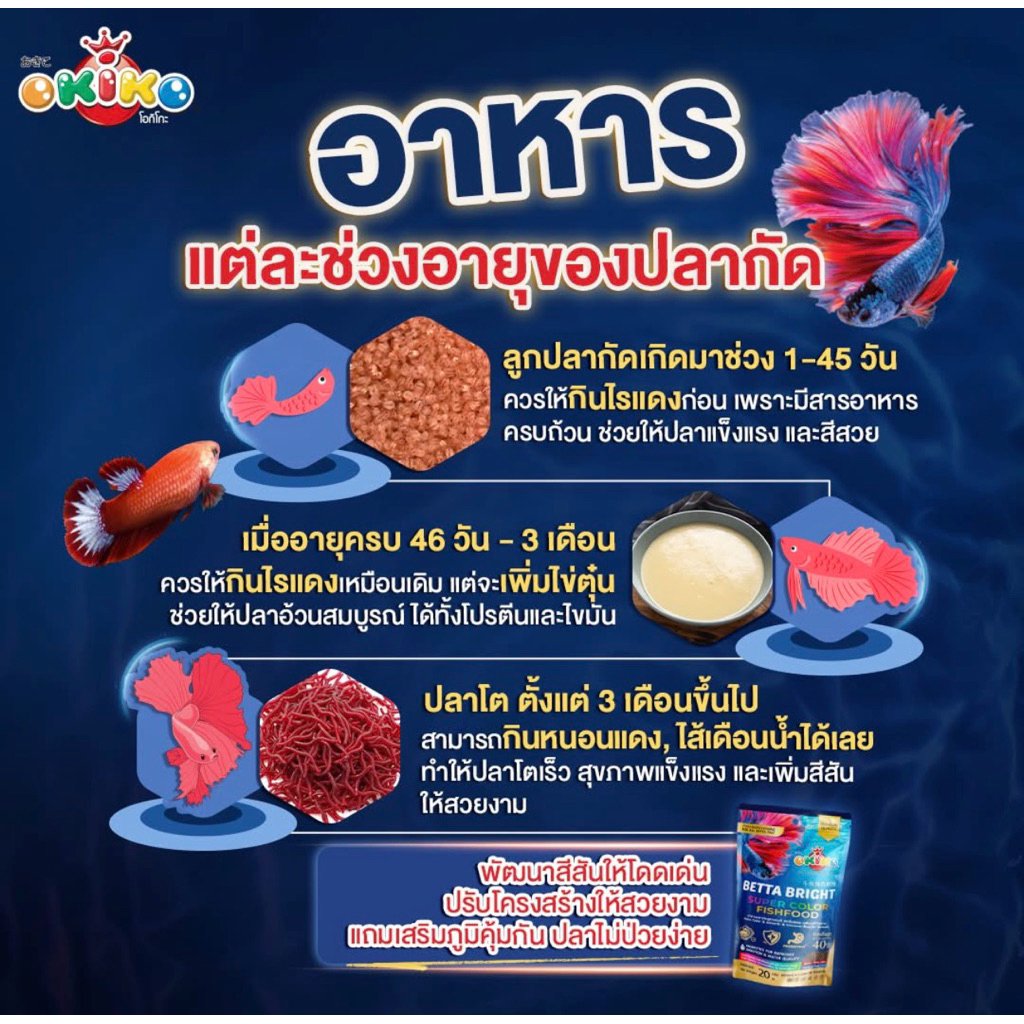 อาหารปลากัด FLAVOR FOR BETTA 30g. และ OKIKO BETTA BRIGHT 20g อาหารปลากัด สูตรเร่งสี เกล็ด ครีบ แข็งแรง ไม่ทำให้น้ำขุ่น