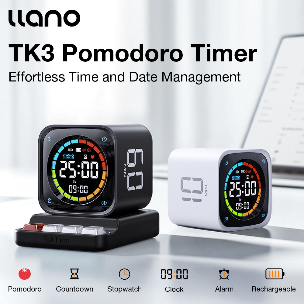 LLANO TK3 Ticktime Timer Cube | 4-ใน-1: นับถอยหลัง, โพโดโร, สัญญาณเตือน, นาฬิกาจับเวลา | เวลาที่กําหนดเอง | จอแสดงผล นํา ขนาดใหญ่ | ตัวจับเวลาการศึกษาอัจฉริยะแบบชาร์จไฟได้และพกพาได้สําหรับเด็ก