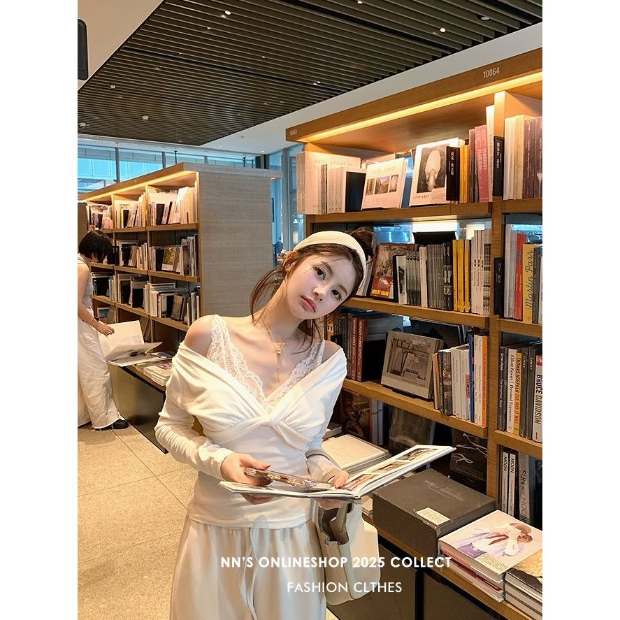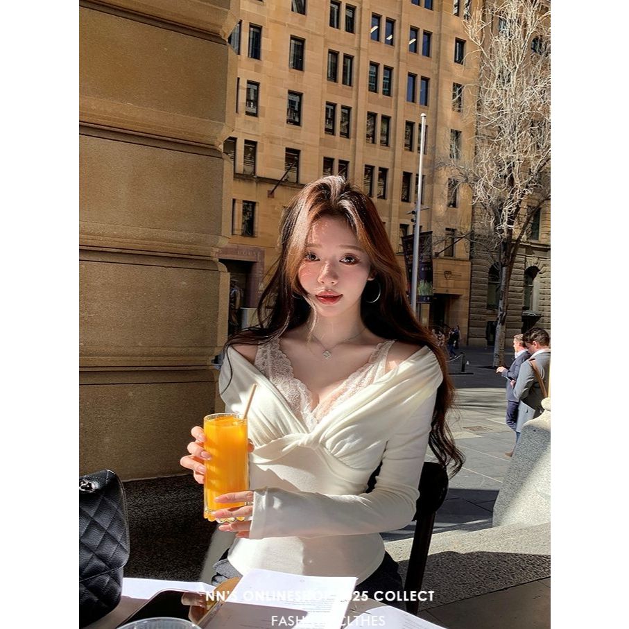 เสื้อยืดผู้หญิงฤดูใบไม้ร่วง แขนยาว ลายเย็บลูกไม้ปลอม สไตล์สลิมฟิต