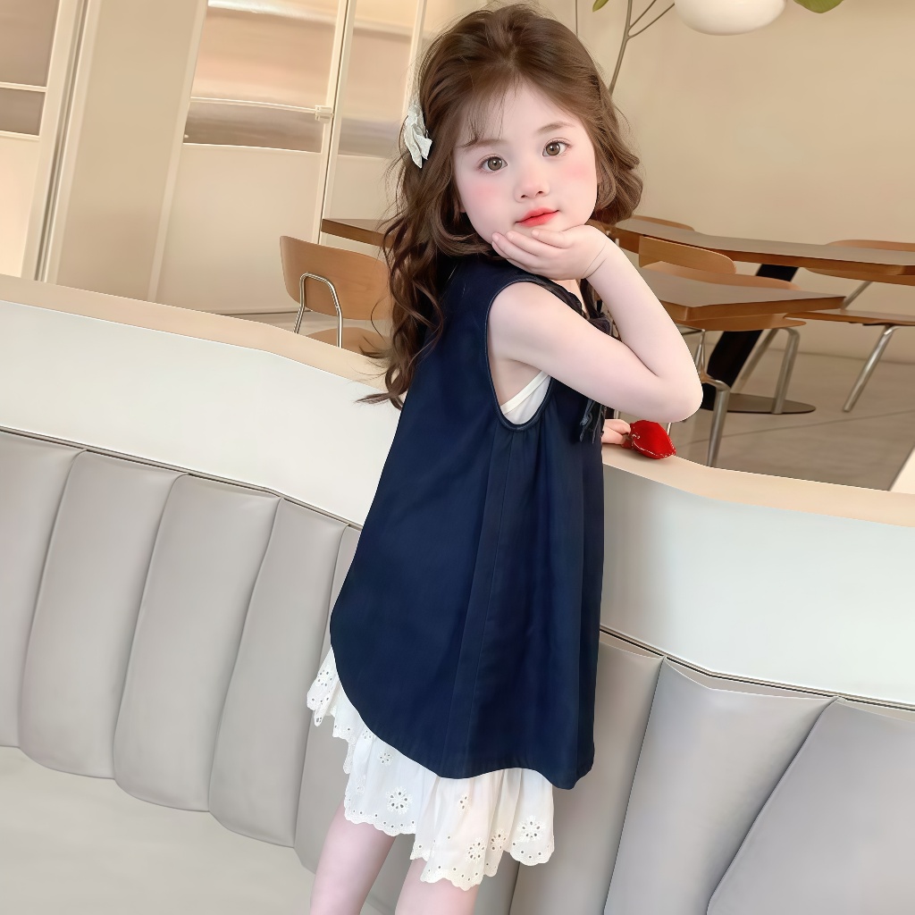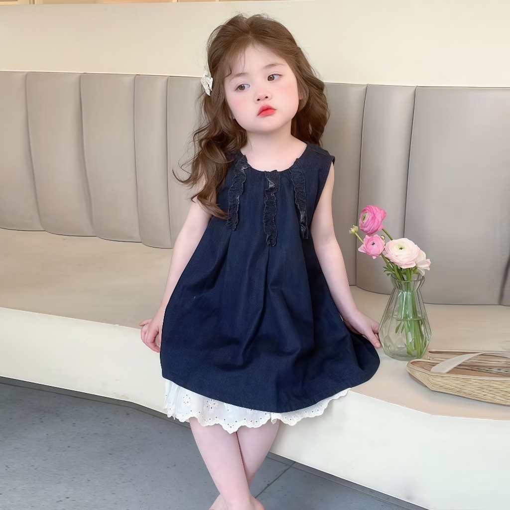 2-12 ปี ชุดเดรสเด็กผู้หญิง กระโปรงยีนส์ เดรสแขนกุด ผ้าบาง นุ่ม สบาย เซ็ต 2 ชิ้น