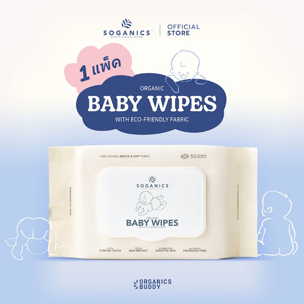SOGANICS Organic Baby Wipes (50 Sheets) ทิชชู่เปียก ทำความสะอาดผิว ผ้านุ่มละมุนจากใยธรรมชาติ 100%