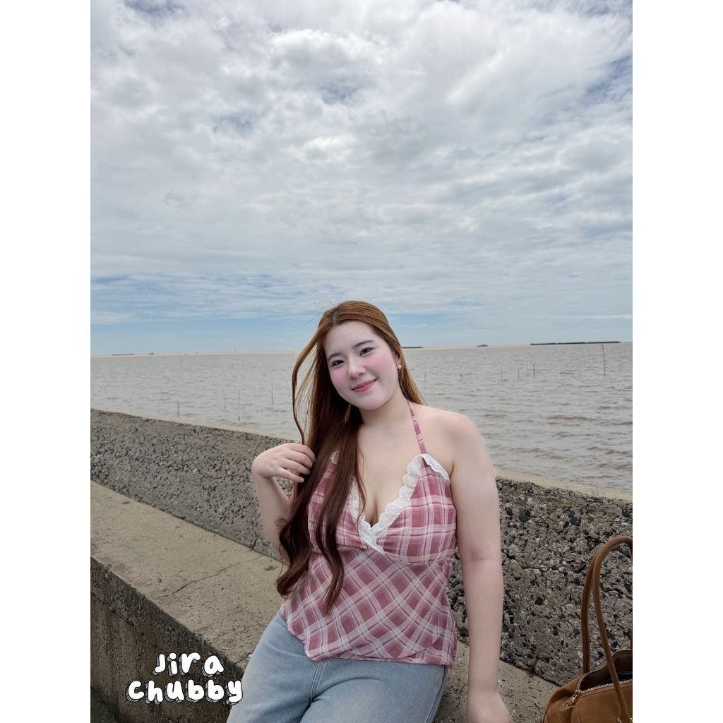 เสื้อคล้องคอ ลายสก็อตสาวอวบ สม็อคหลังยืดเยอะ มีซับใน