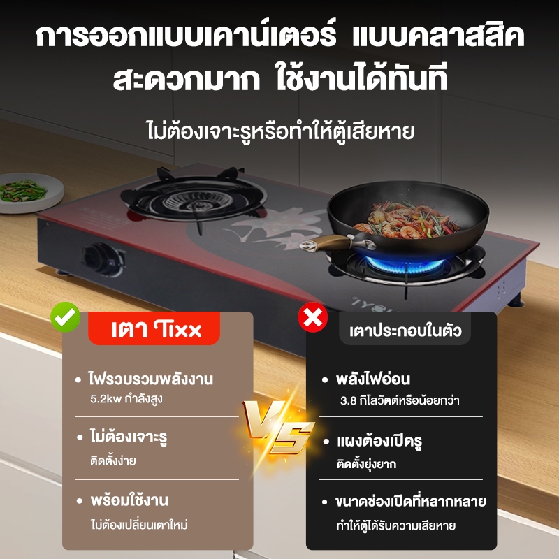 Tixx เตาแก๊สครัว 2 หัว แบบตั้งโต๊ะ 5200w เตาแก๊สกระจกนิรภัยหัวคู่ อินฟาเรด ทำความสะอาดง่าย