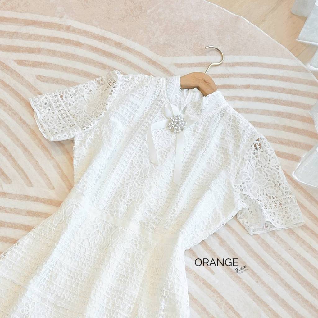 OR8893 เดรสลูกไม้ยาว ทรงคอตั้ง พร้อมเข็มกลัดโบ ชุดเรียบร้อยใส่เที่ยว ใส่ทำบุญ ใส่ทำงานได้