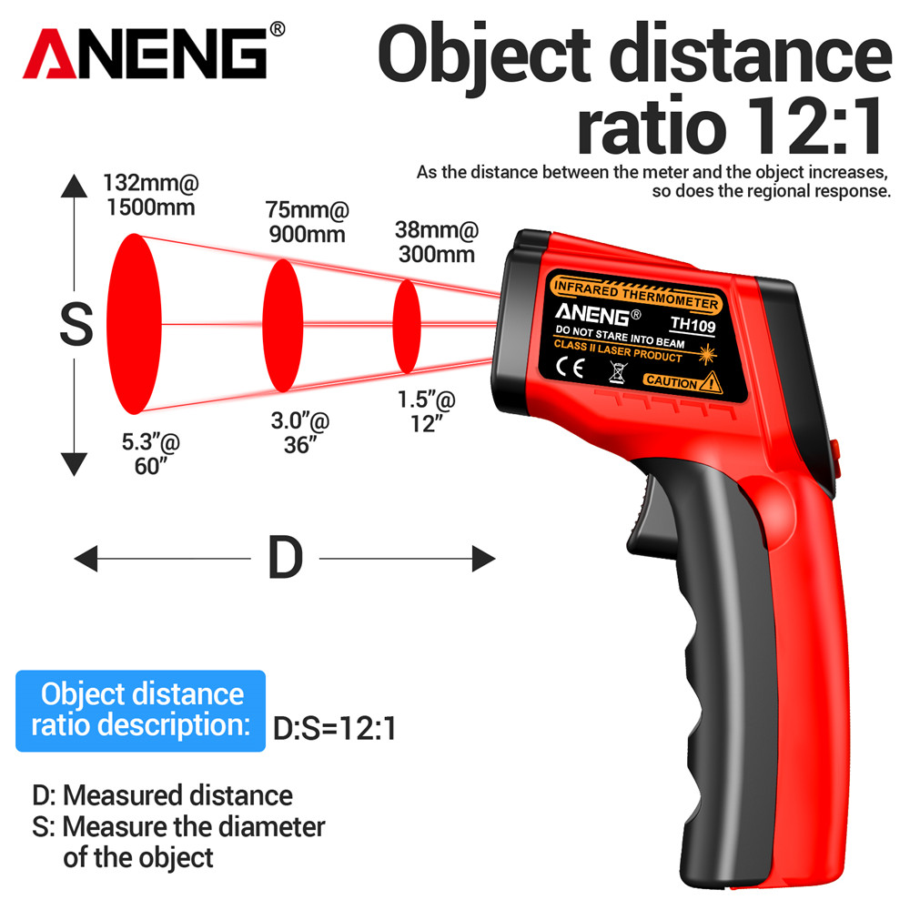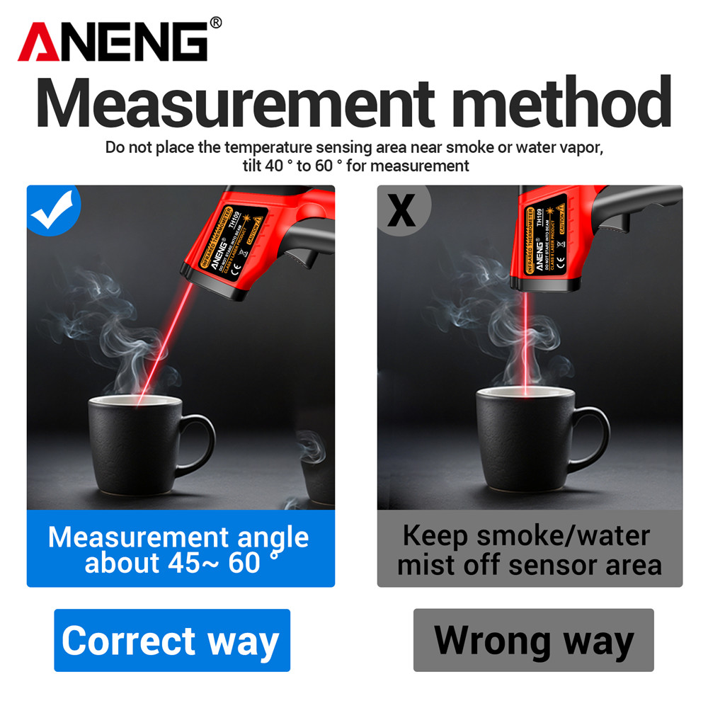 ANENG TH109 เครื่องวัดอุณหภูมิอินฟราเรดดิจิตอล -50~400℃ เครื่องวัดอุณหภูมิแบบไม่สัมผัสพร้อมจอแสดงผล จอแอลซีดี และฟังก์ชั่นไฮโกรมิเตอร์