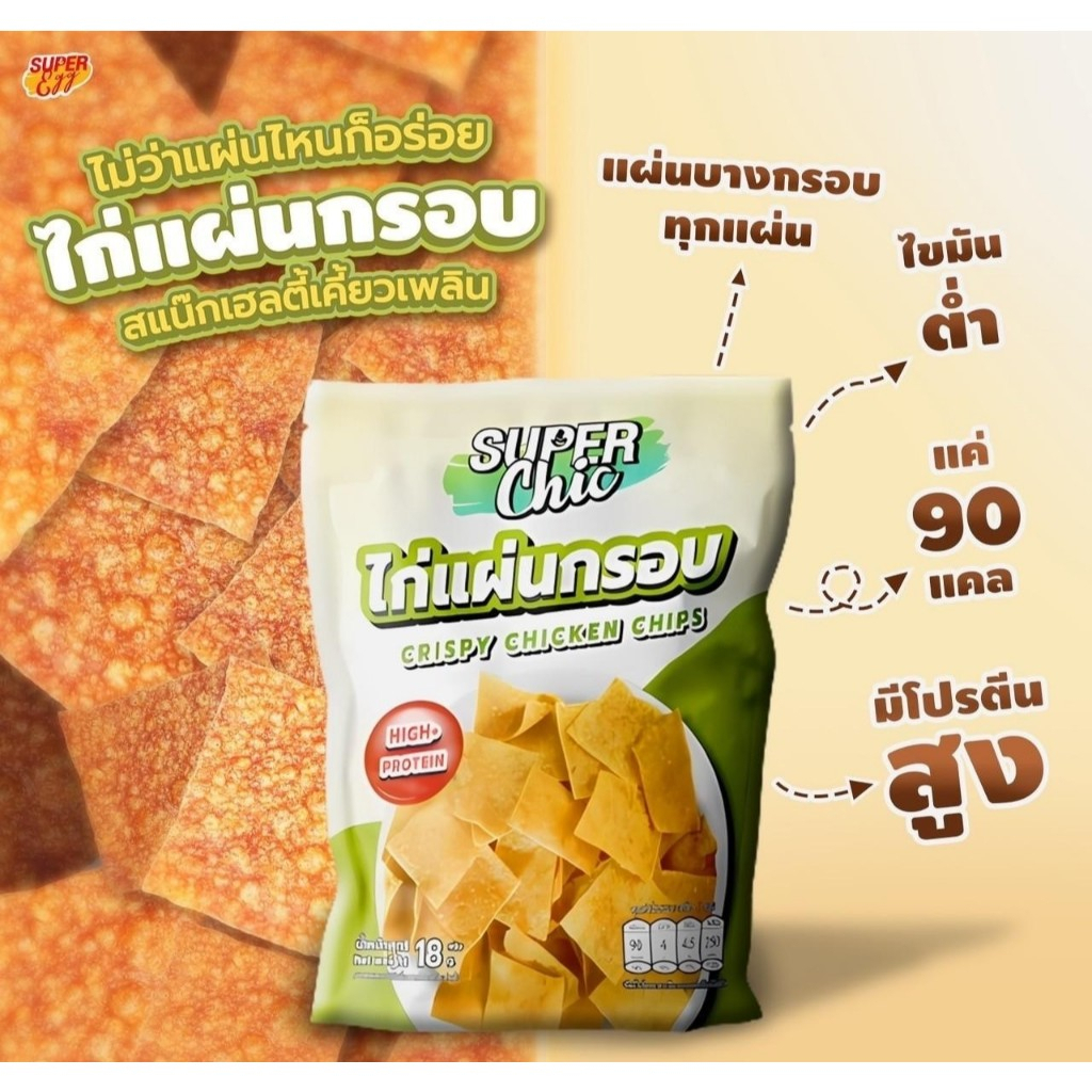 แพ็คสุดคุ้ม 5 ห่อ 159.- ไก่แผ่นกรอบ (ขนาด 18 กรัม) Crispy Chicken Chips แคลน้อย - Super Chic
