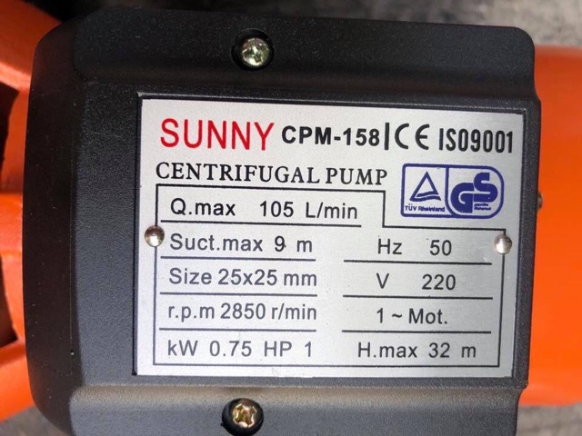ปั๊มน้ำหอยโข่ง ยี่ห้อ sunny ท่อ 1 นิ้ว 1 แรง CPM-158
