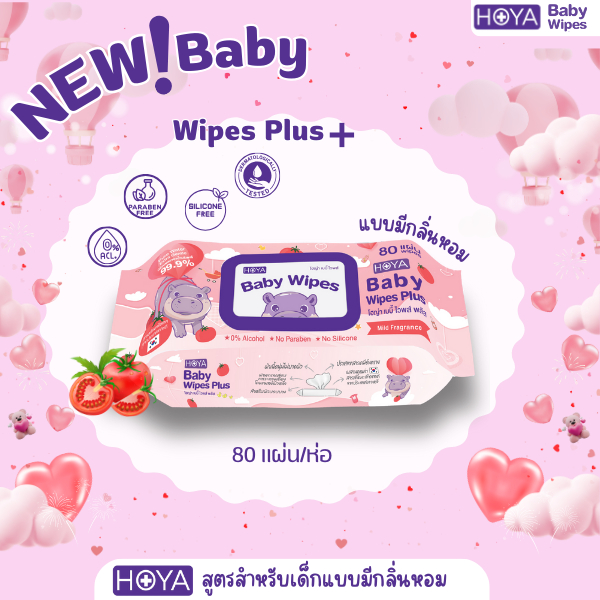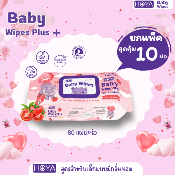 (10ห่อมีน้ำหอม) HOYAทิชชู่เปียก baby Wipes Plus 80แผ่น/ห่อ สูตรมีกลิ่นหอม อ่อนโยนสำหรับผิวบอบบาง