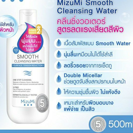 [1แถม1] MizuMi Smooth Cleansing Water 500 ml คลีนซิ่งวอเตอร์ อ่อนโยน สลายเมคอัพ สัมผัสนุ่มลื่น ไม่บาดผิว