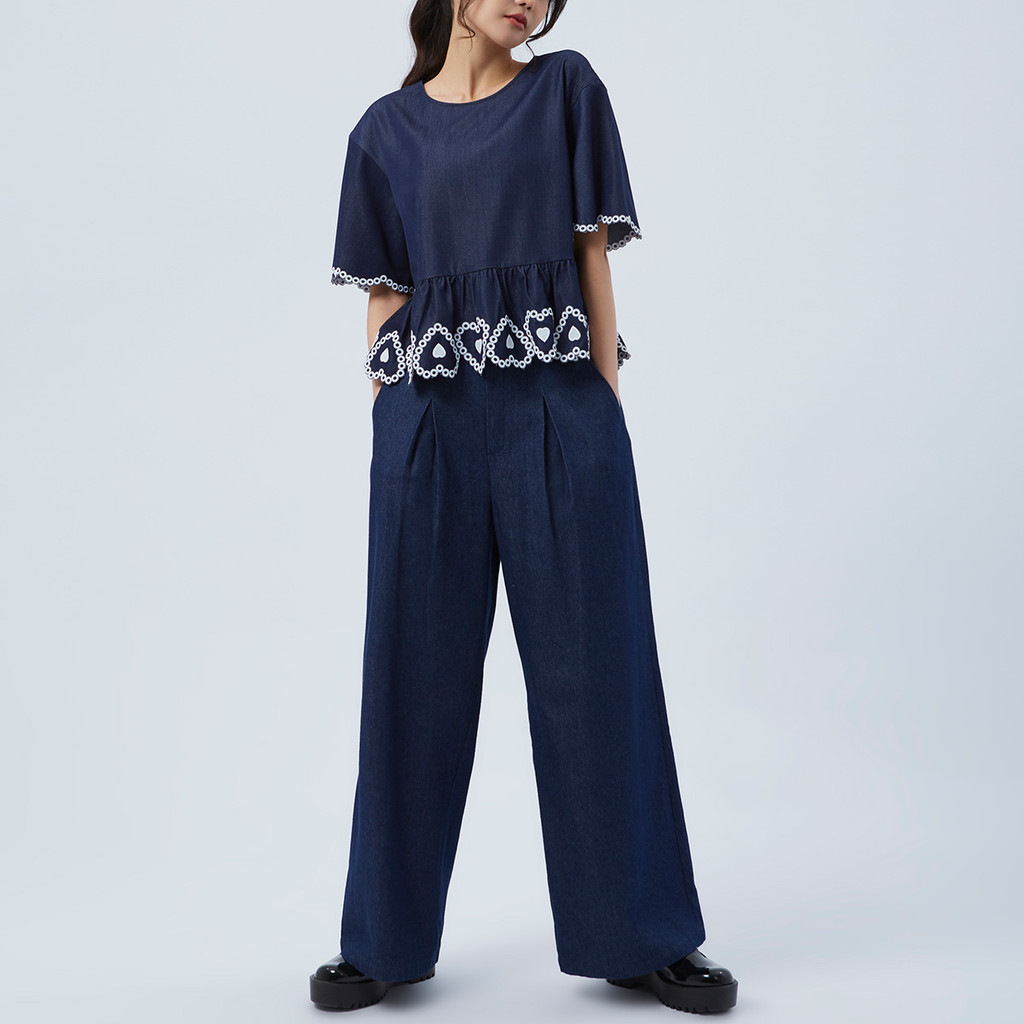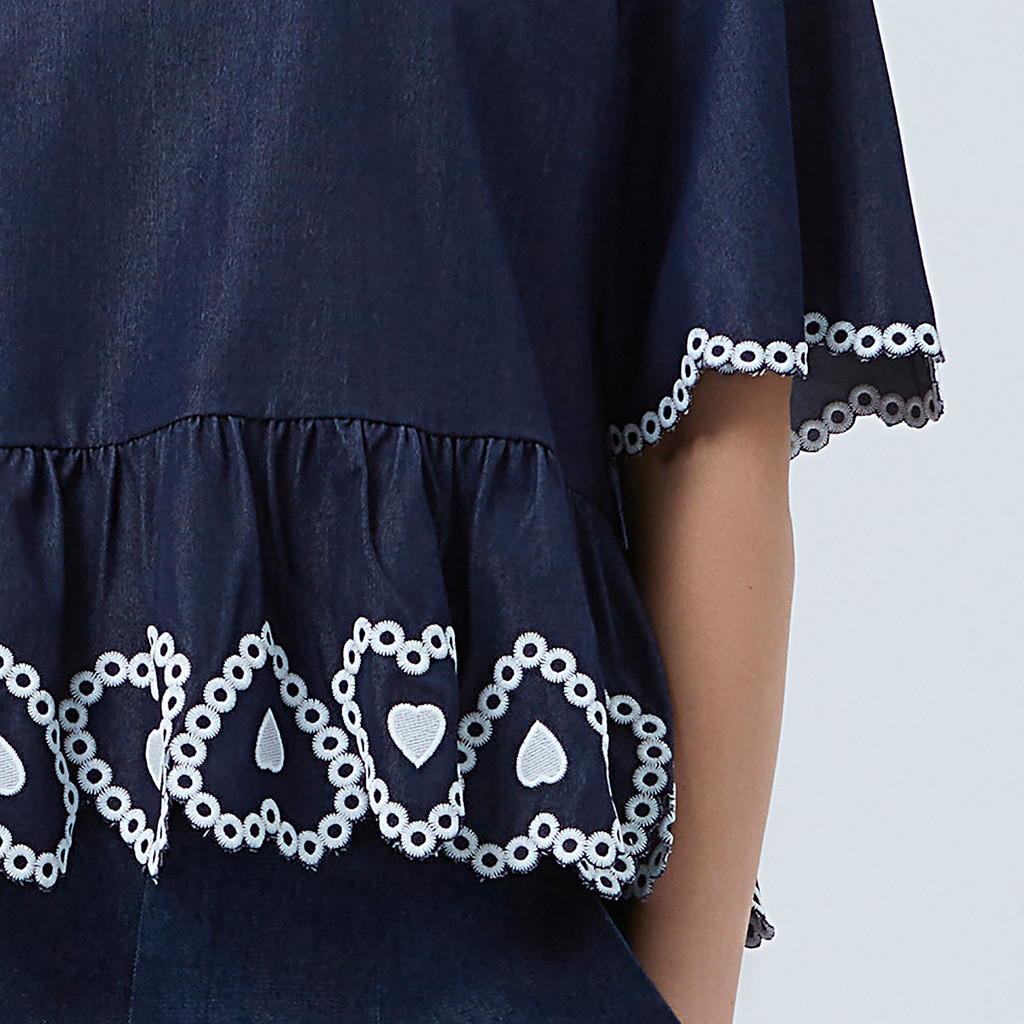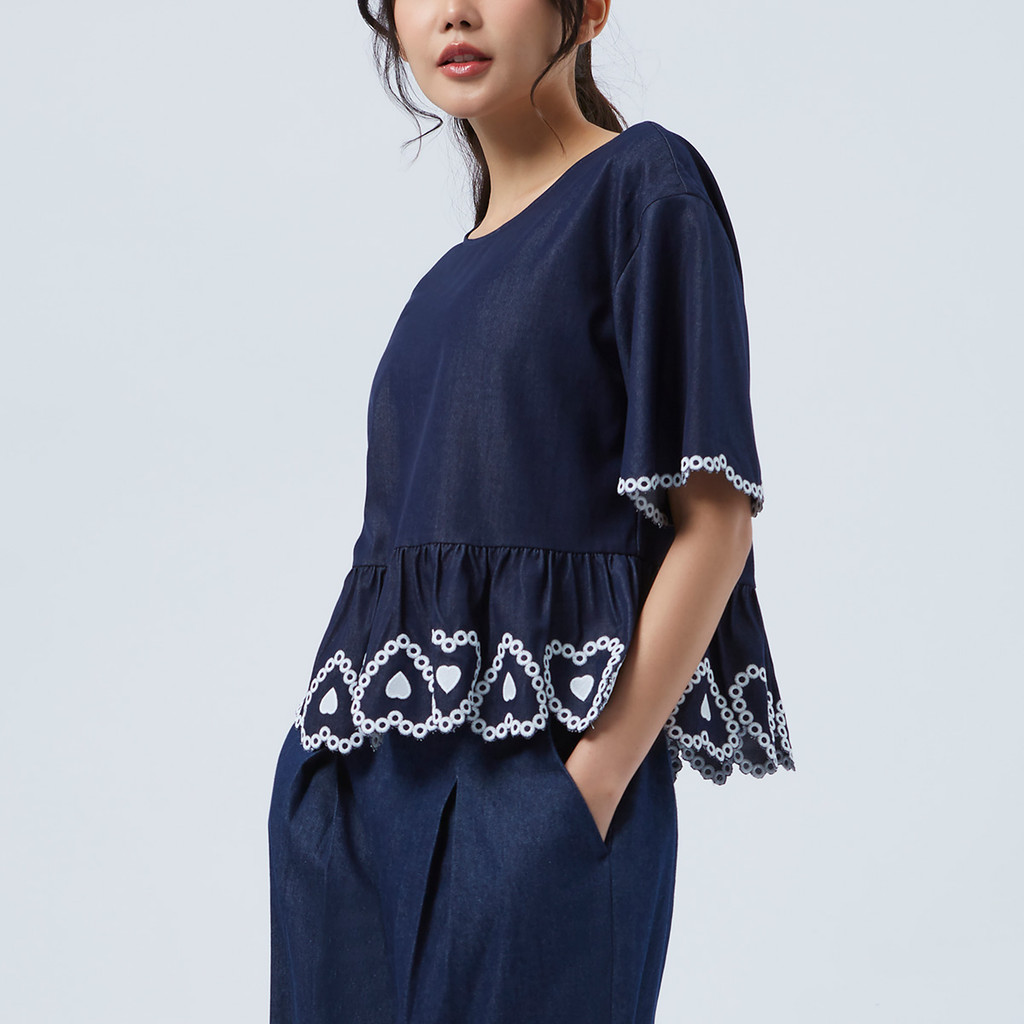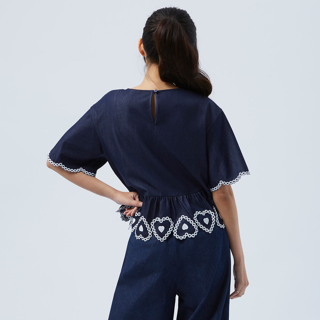 EP เสื้อเบลาส์แขนสั้น ปักลายหัวใจ ผู้หญิง สีน้ำเงินเข้ม | Heart Embroidery Blouse | 04820