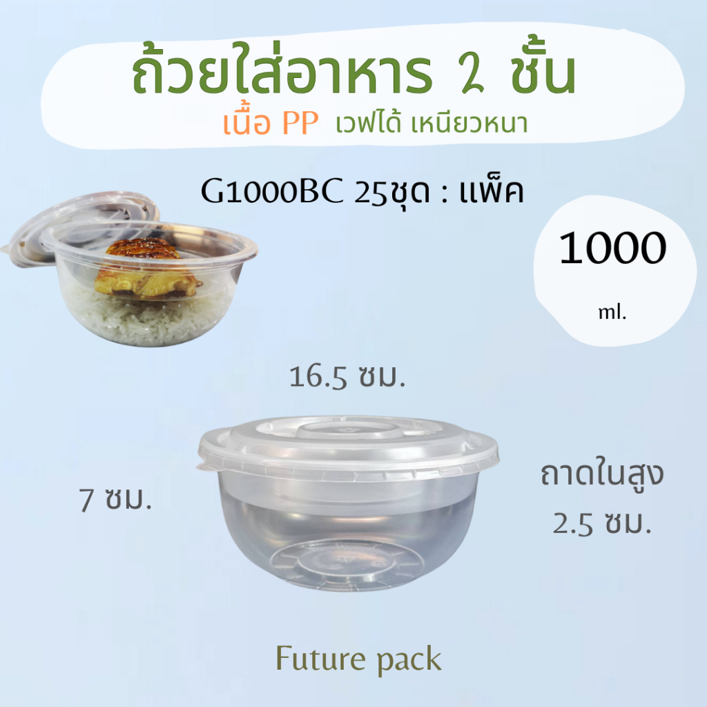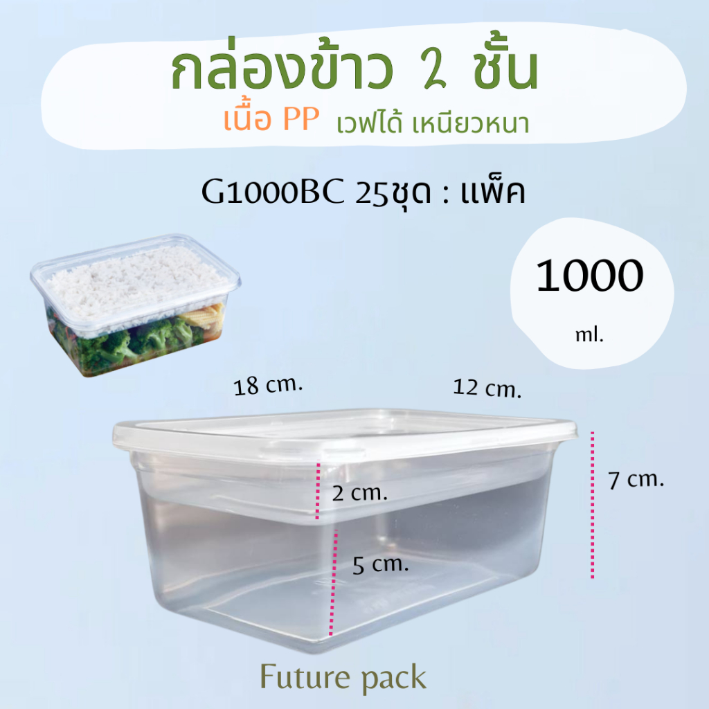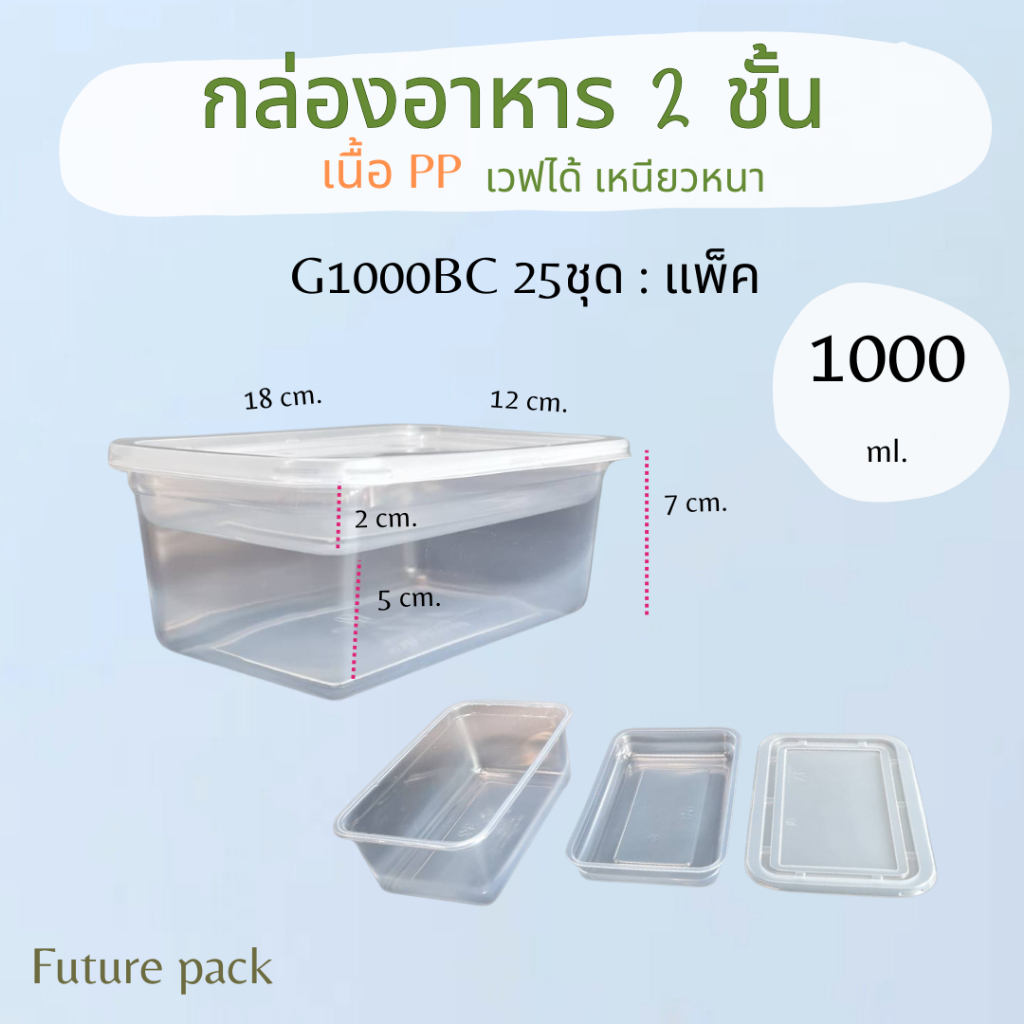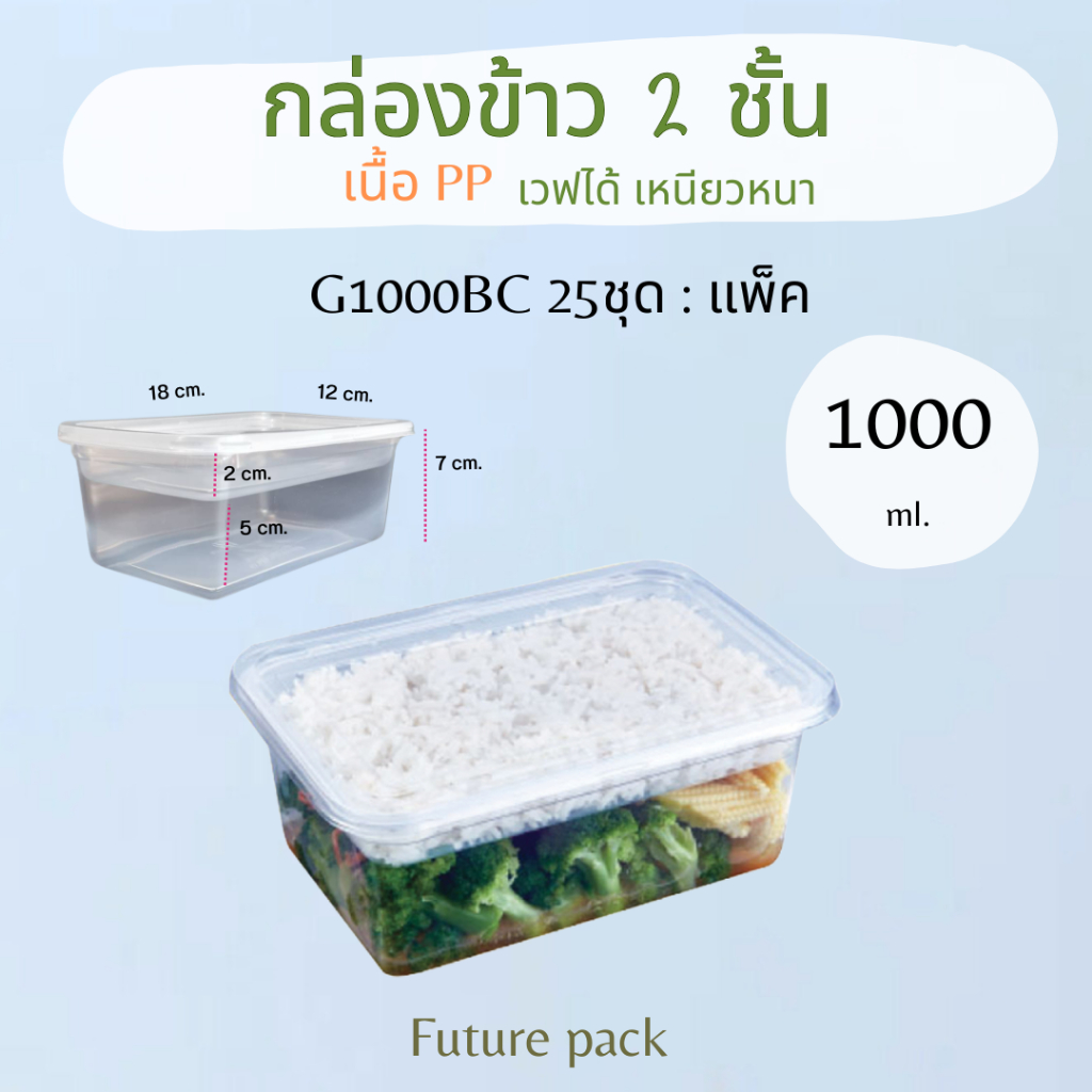 กล่องอาหาร 2 ชั้น PP เหลี่ยม 1000 มล. แพค 25 ชุด