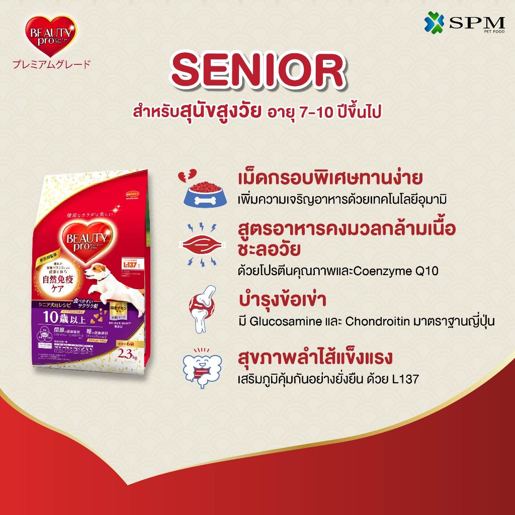 BeautyPro อาหารเม็ดสุนัขพรีเมียม สูตร Senior สูงวัยอายุ 7-10 ปี+ ขนาด 2.3 Kg. ปรับสมดุลทางเดินอาหาร