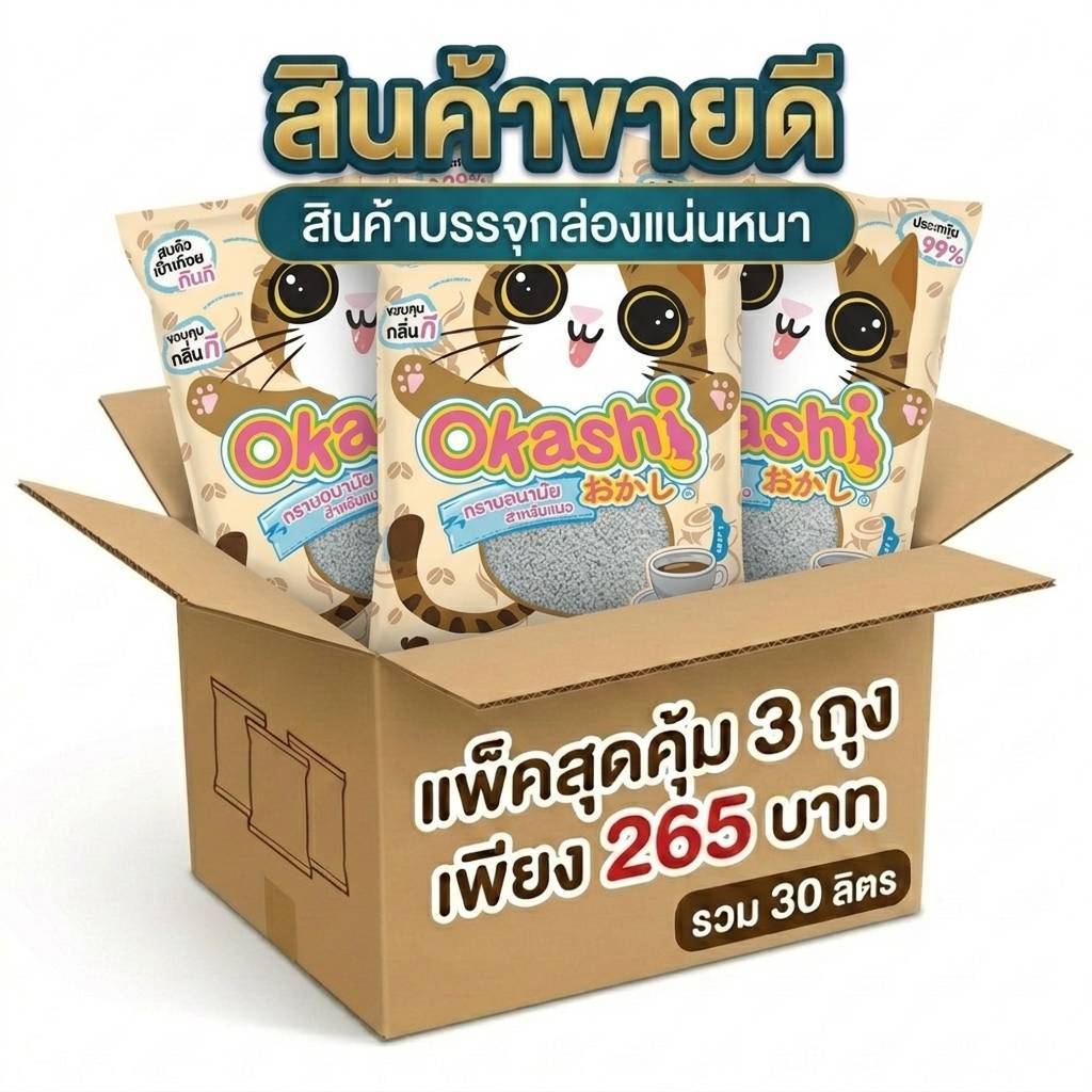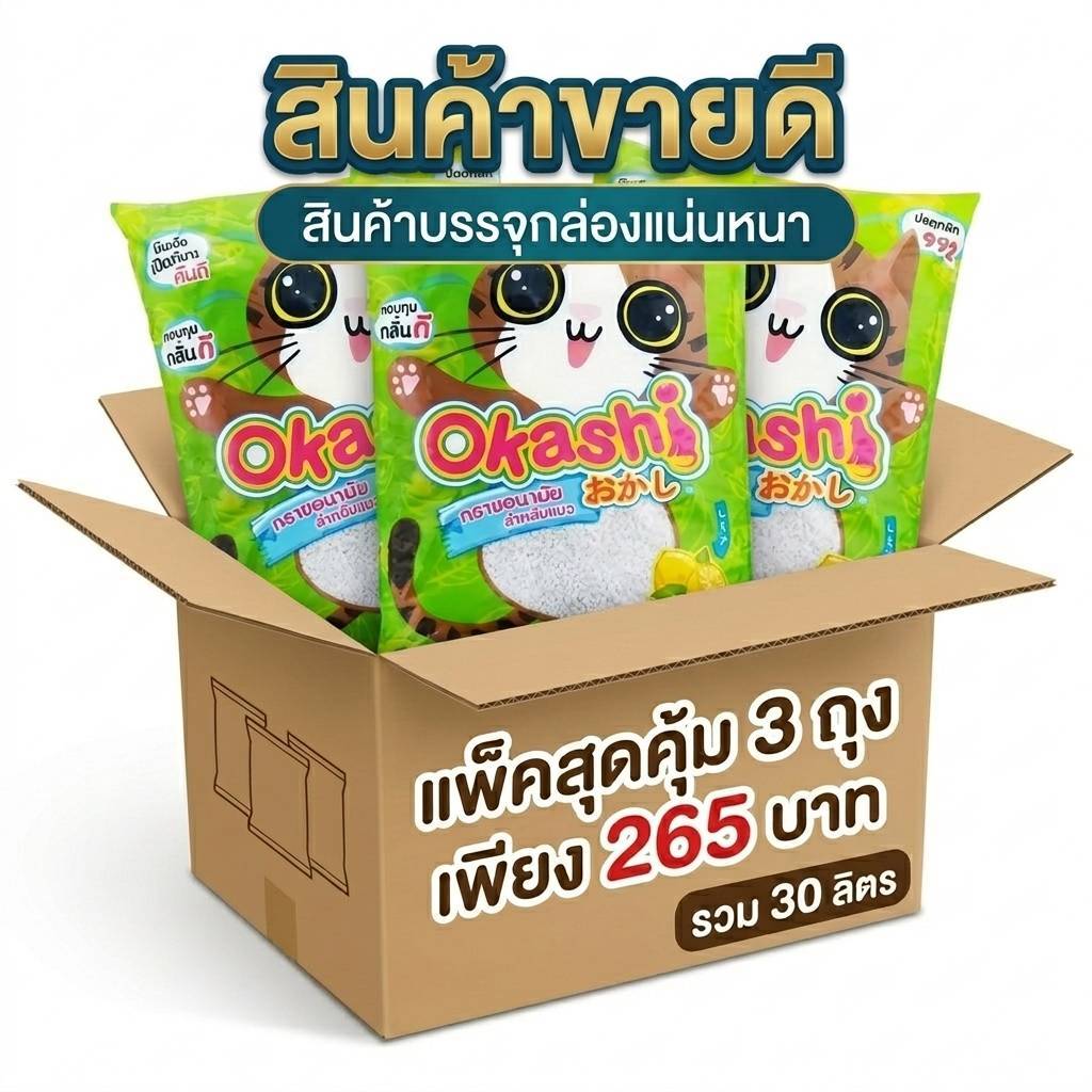 Okashi ทรายแมว ขนาด 10 ลิตร 3 ถุง = 30 ลิตร สูตรประหยัดทราย 15% (สินค้าบรรจุกล่อง)