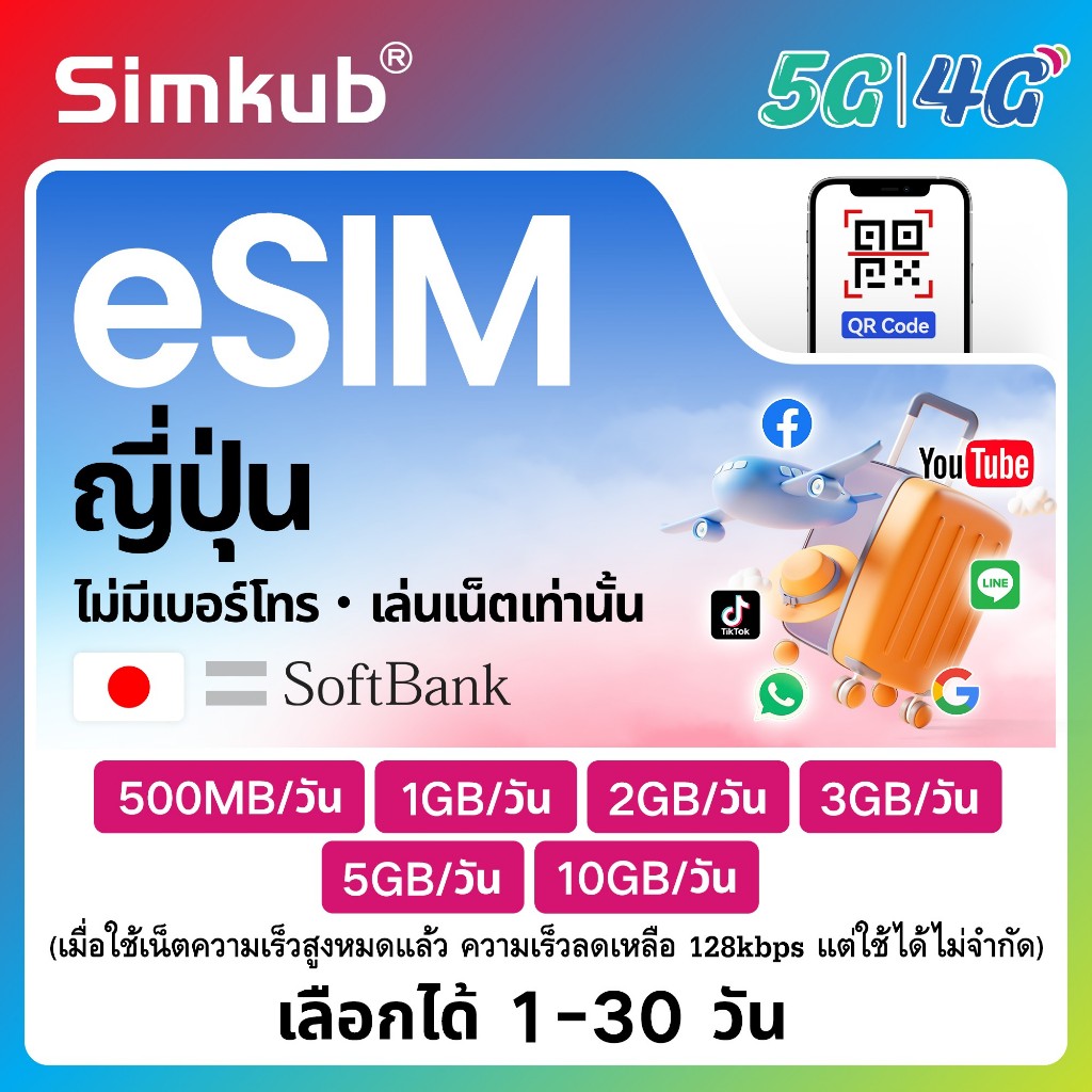 eSIM Japan เครือข่าย SoftBank ซิมท่องเที่ยว ญี่ปุ่น เน็ต 500MB-10GB/วัน รองรับ 5G/4G เลือกได้ 1-30 วัน