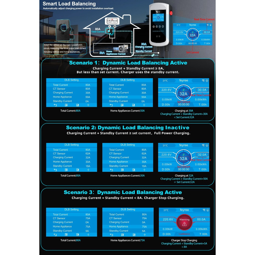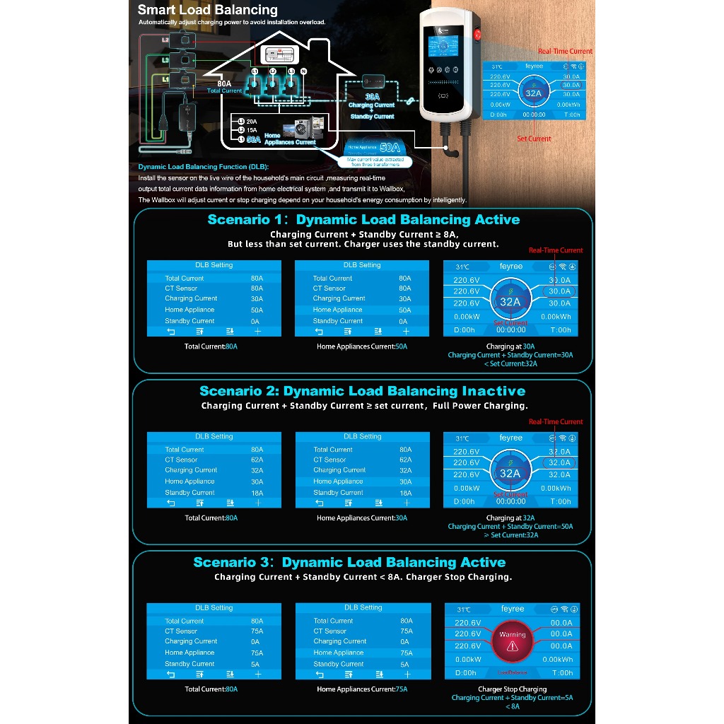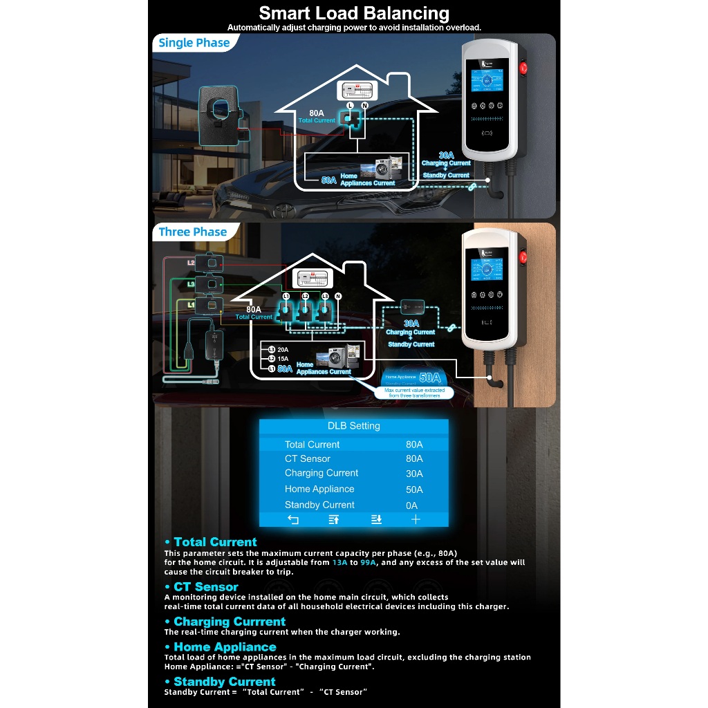Feyree Type2 EV Charger หน้าจอ 4.3 นิ้ว 32A 7.6KW แบบไดนามิกโหลด Blancing 11KW 22KW 3Phase EVSE Wallbox APP พร้อมชาร์จประวัติ